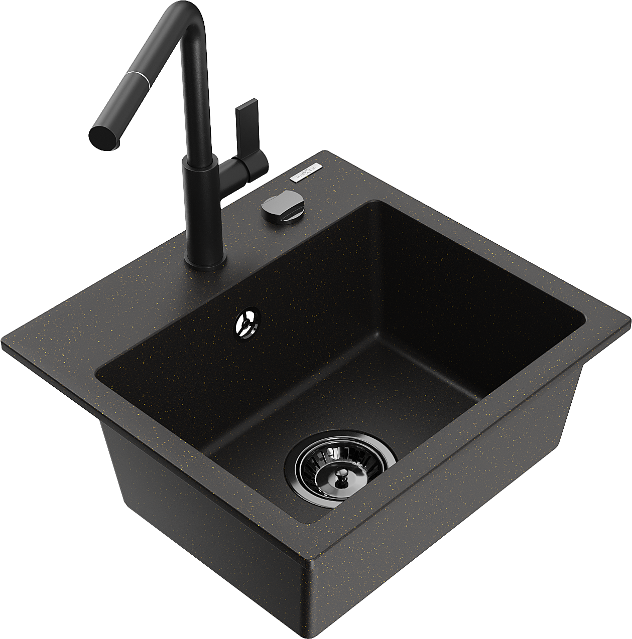 Mexen Milo vienkameras granīta izlietne ar virtuves jaucējkrānu Flora, melna/zeltains metālisks - 6505-75-670401-70-B