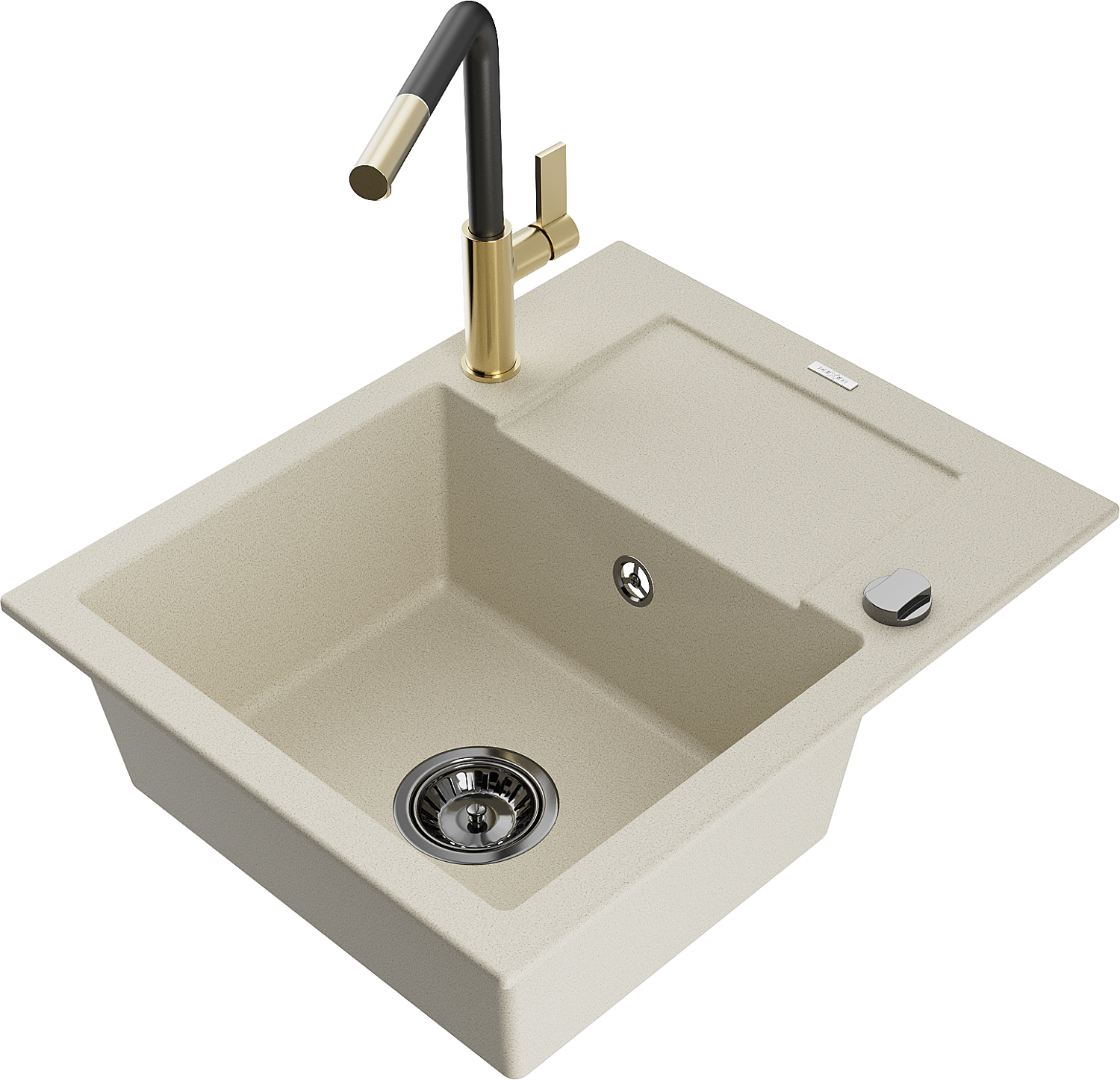 Mexen Enzo granīta izlietne ar 1 nodalījumu, notecinātāju un virtuves jaucējkrānu Flora, bēšs - 6506-69-670401-57-B