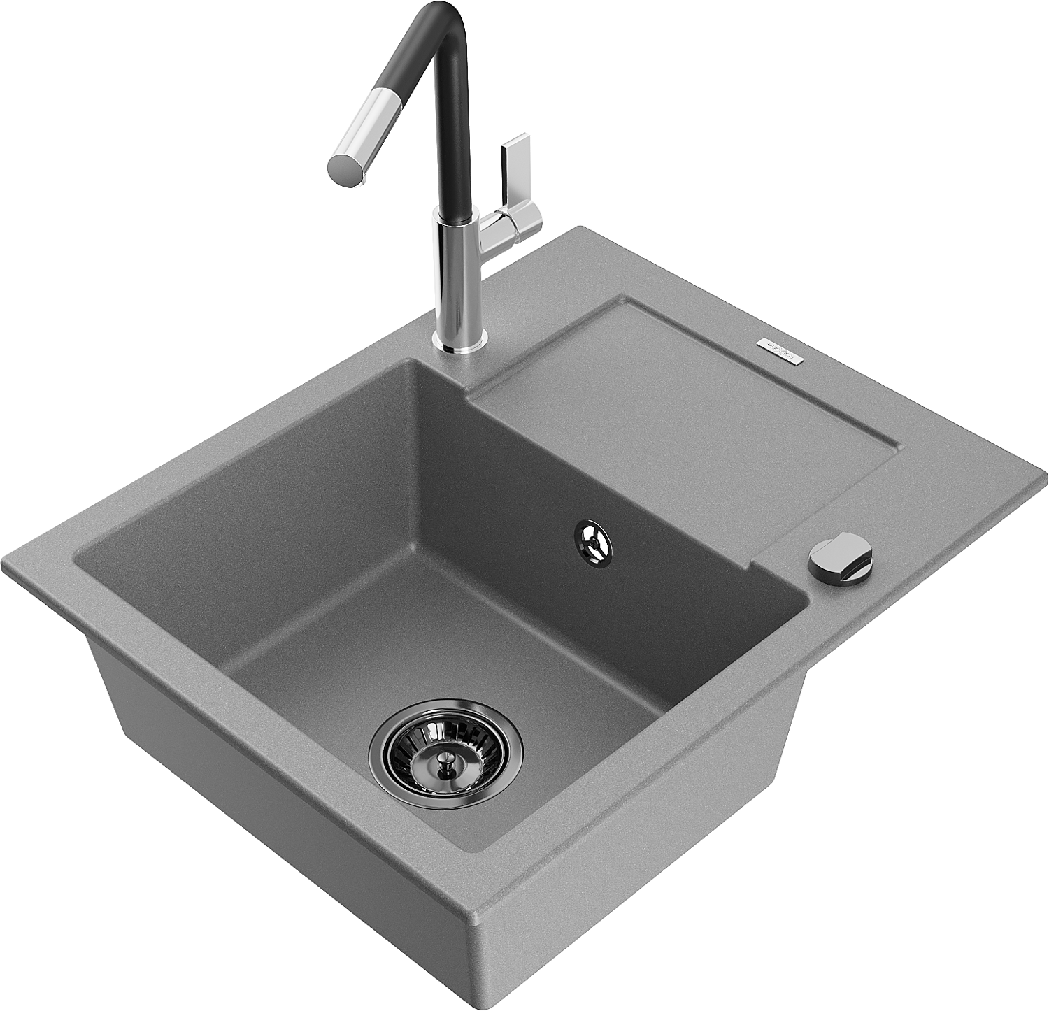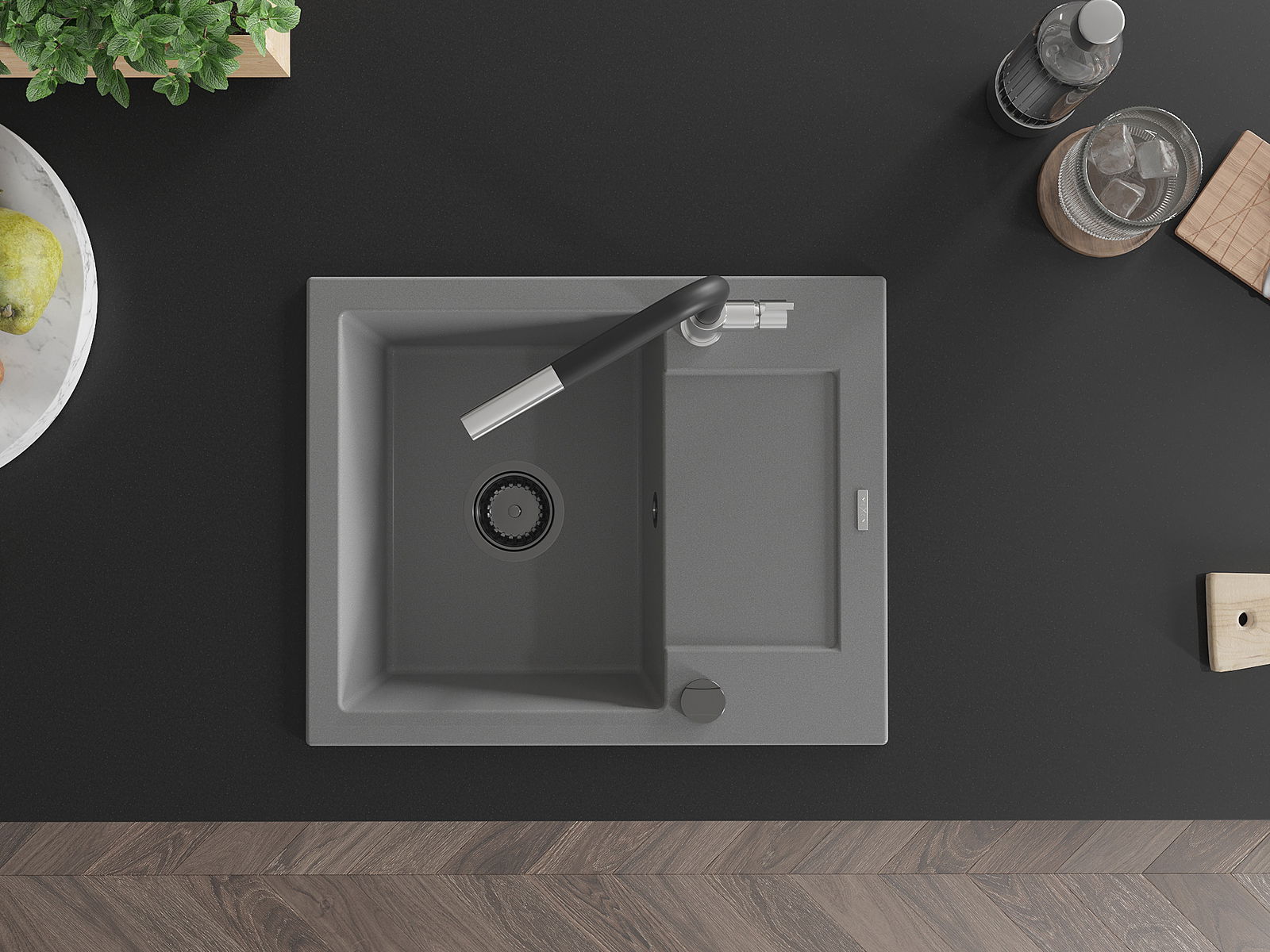 Mexen Enzo granit izlietne ar vienu nodalījumu ar noteces paneli un virtuves jaucējkrānu Flora, pelēks - 6506-71-670401-07-B
