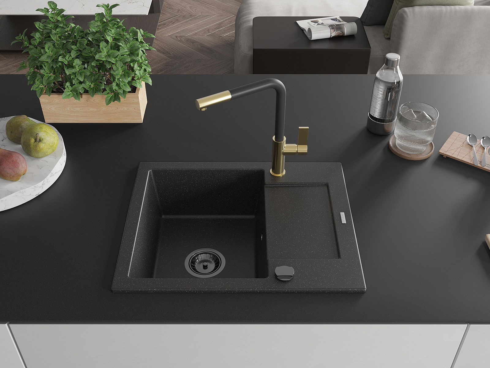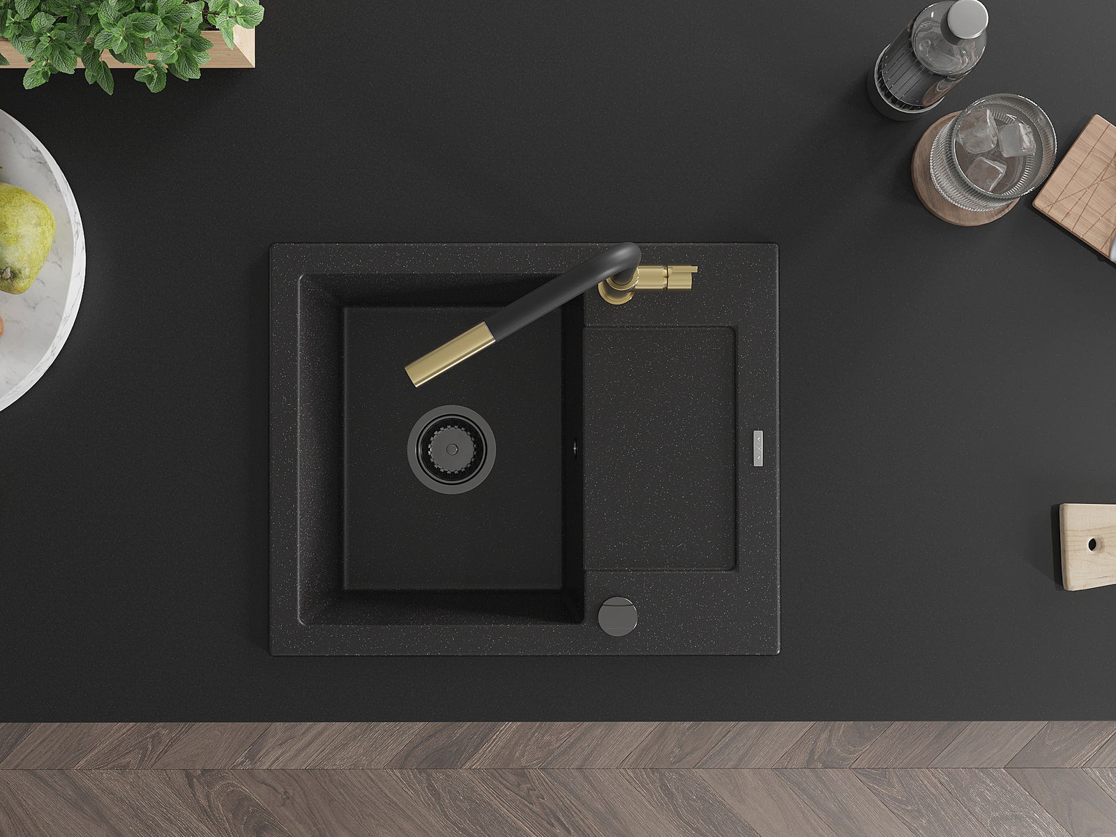 Mexen Enzo granitizlietne ar vienu nodalījumu, notecētāju un Flora virtuves jaucējkrānu, melna/sudraba metālika