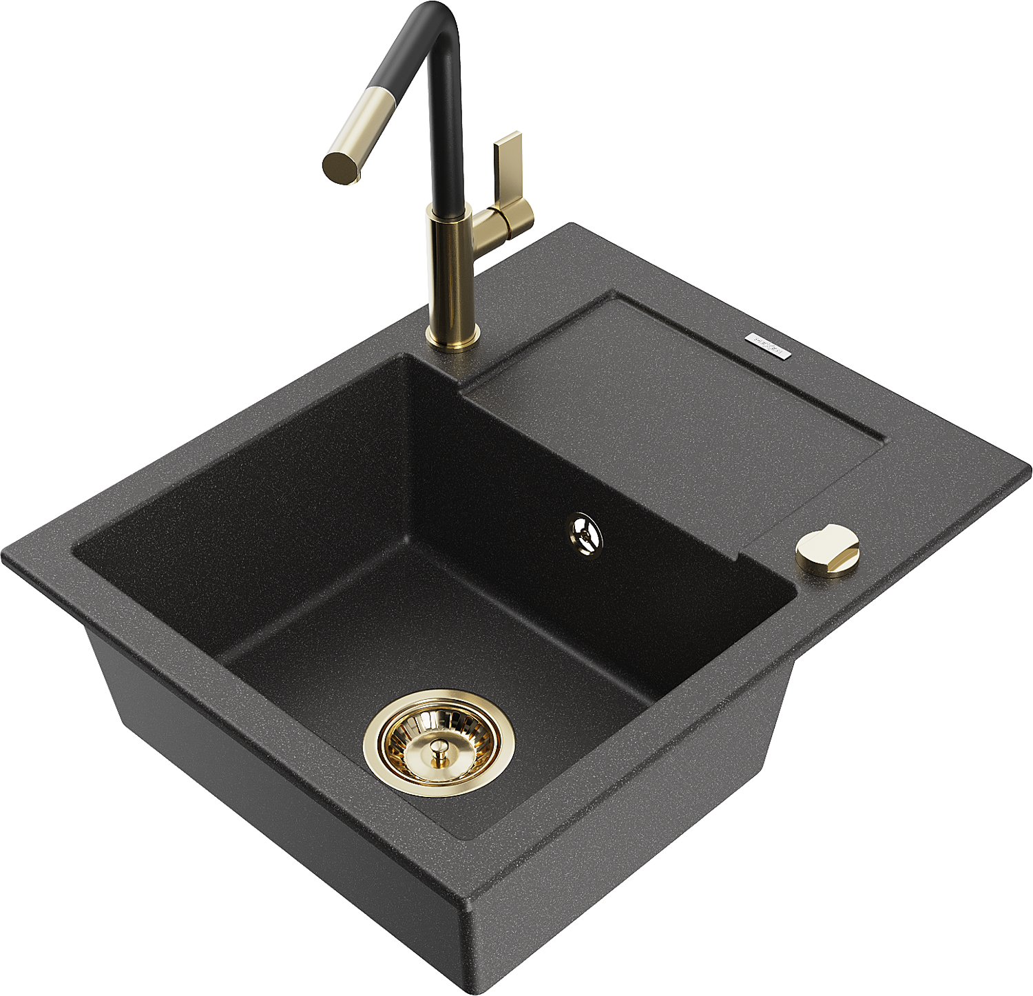 Mexen Enzo granitā izlietne ar 1 nodalījumu un noteku un virtuves jaucējkrānu Flora, melna ar plankumiem - 6506-76-670401-57-G