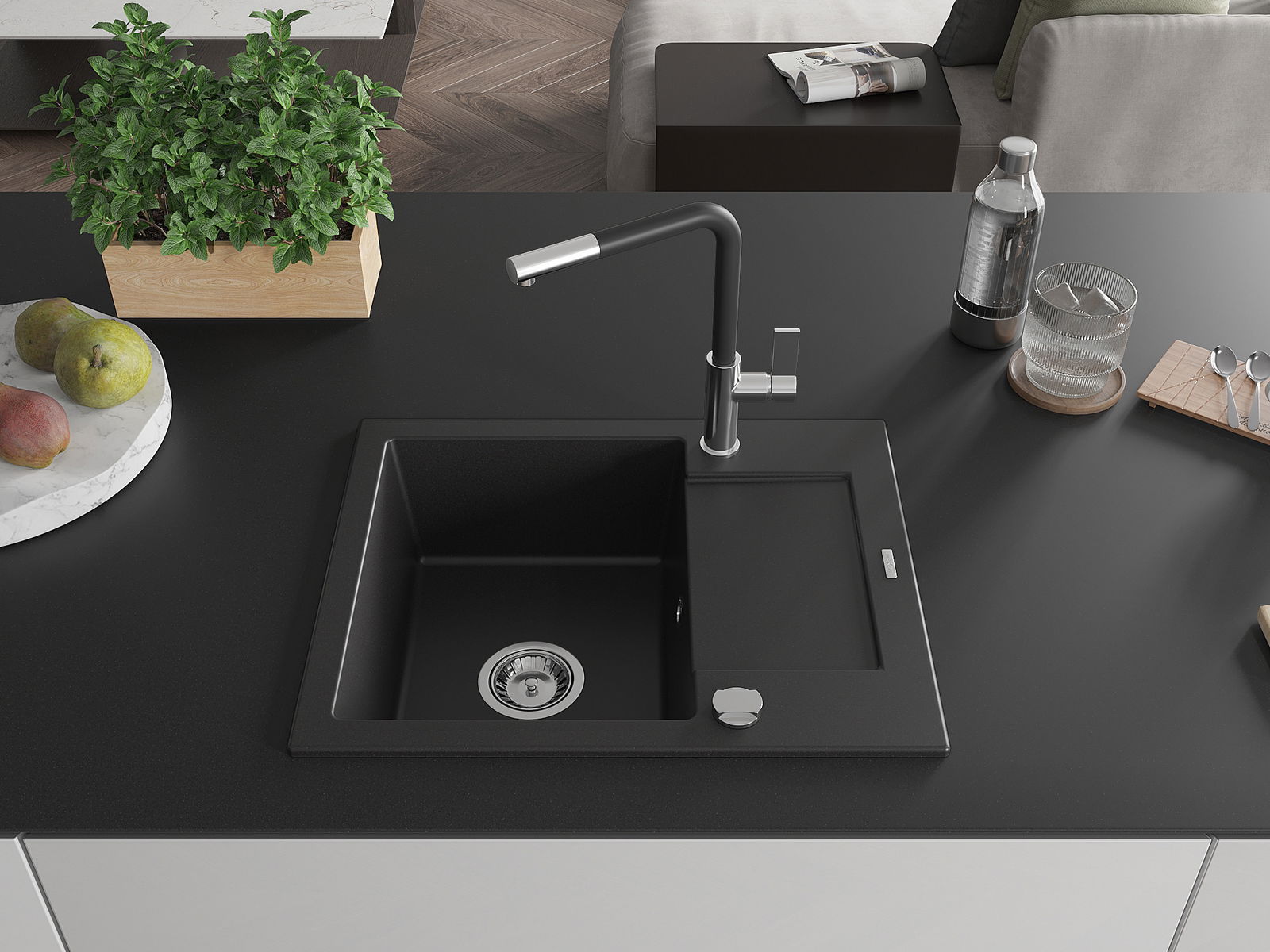 Mexen Enzo granīta izlietne ar vienu nodalījumu, noteka un virtuves jaucējkrānu Flora, melna - 6506-77-670401-07