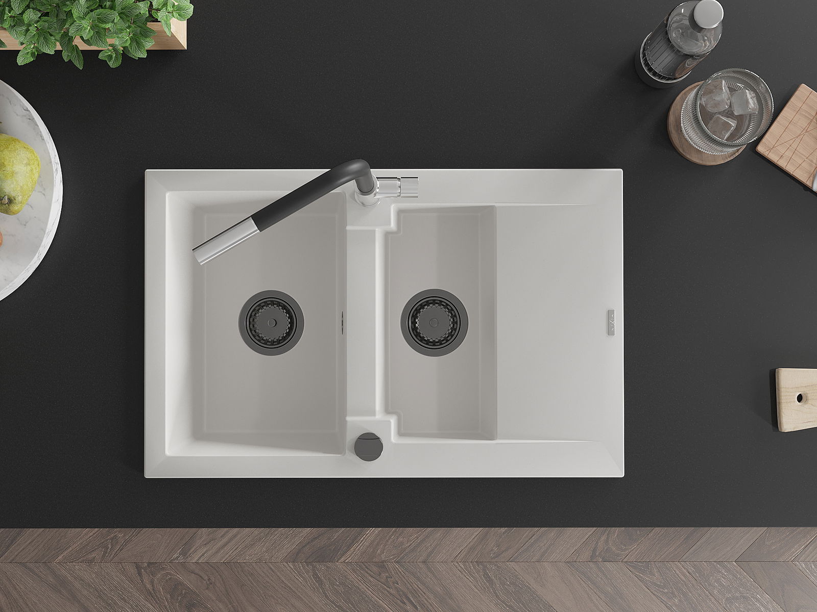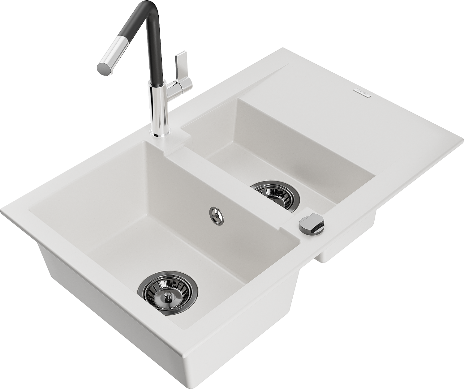 Mexen Gaspar granitā izlietne ar 1,5 nodalījumiem, notecētāju un Flora virtuves jaucējkrānu, balts - 6507-20-670401-07-B