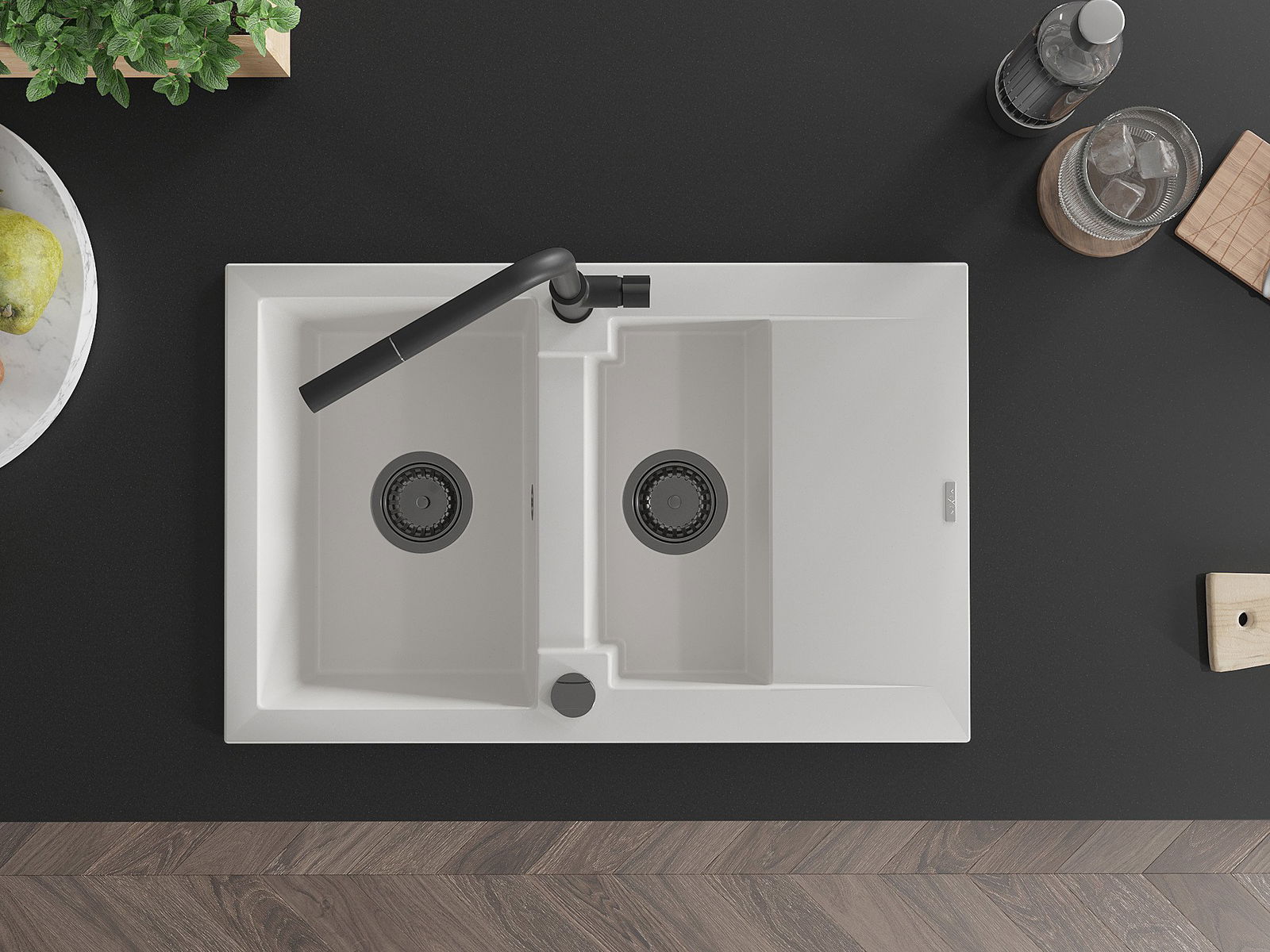 Mexen Gaspar granitais izlietne ar 1,5 kamerām, ar noteci un virtuves jaucējkrānu Flora, balts - 6507-20-670401-70-B