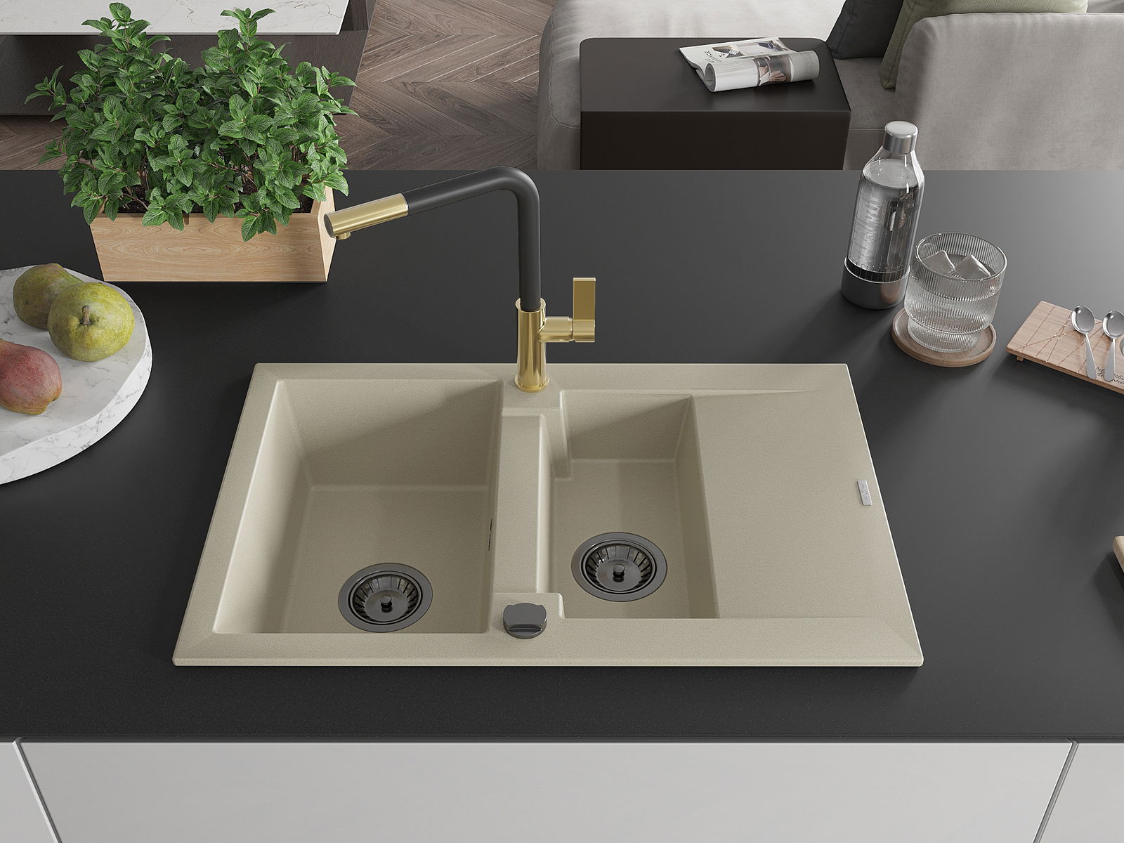Mexen Gaspar granitā izlietne 1,5 nodalījumu ar notekas un virtuves jaucējkrānu Flora, bēšs - 6507-69-670401-57-B
