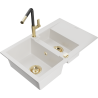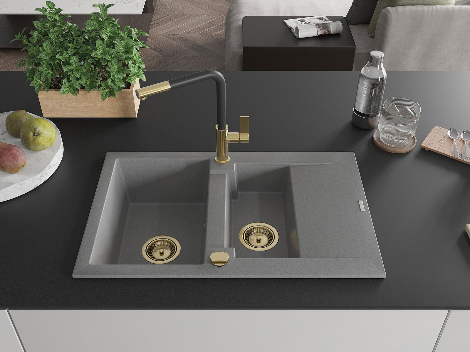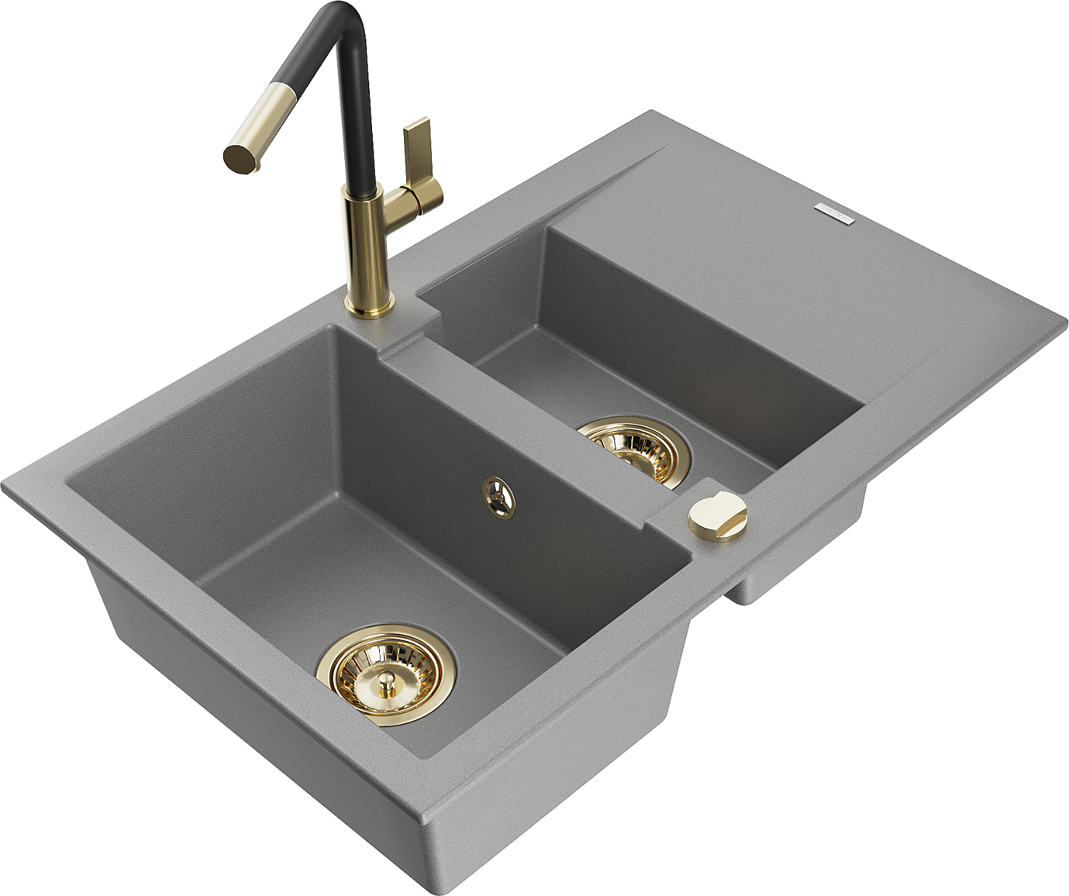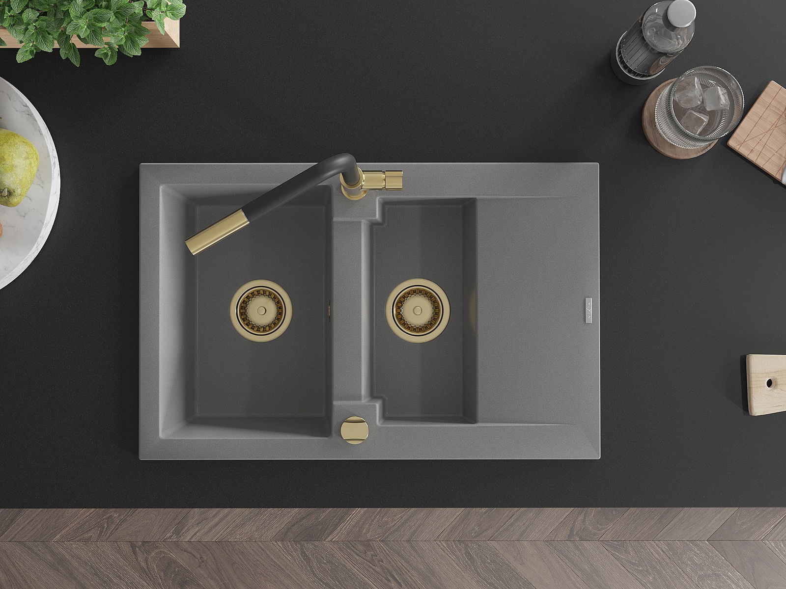 Mexen Gaspar granīta izlietne ar 1,5 nodalījumiem, ar žāvētāju un virtuves jaucējkrānu Flora, pelēka