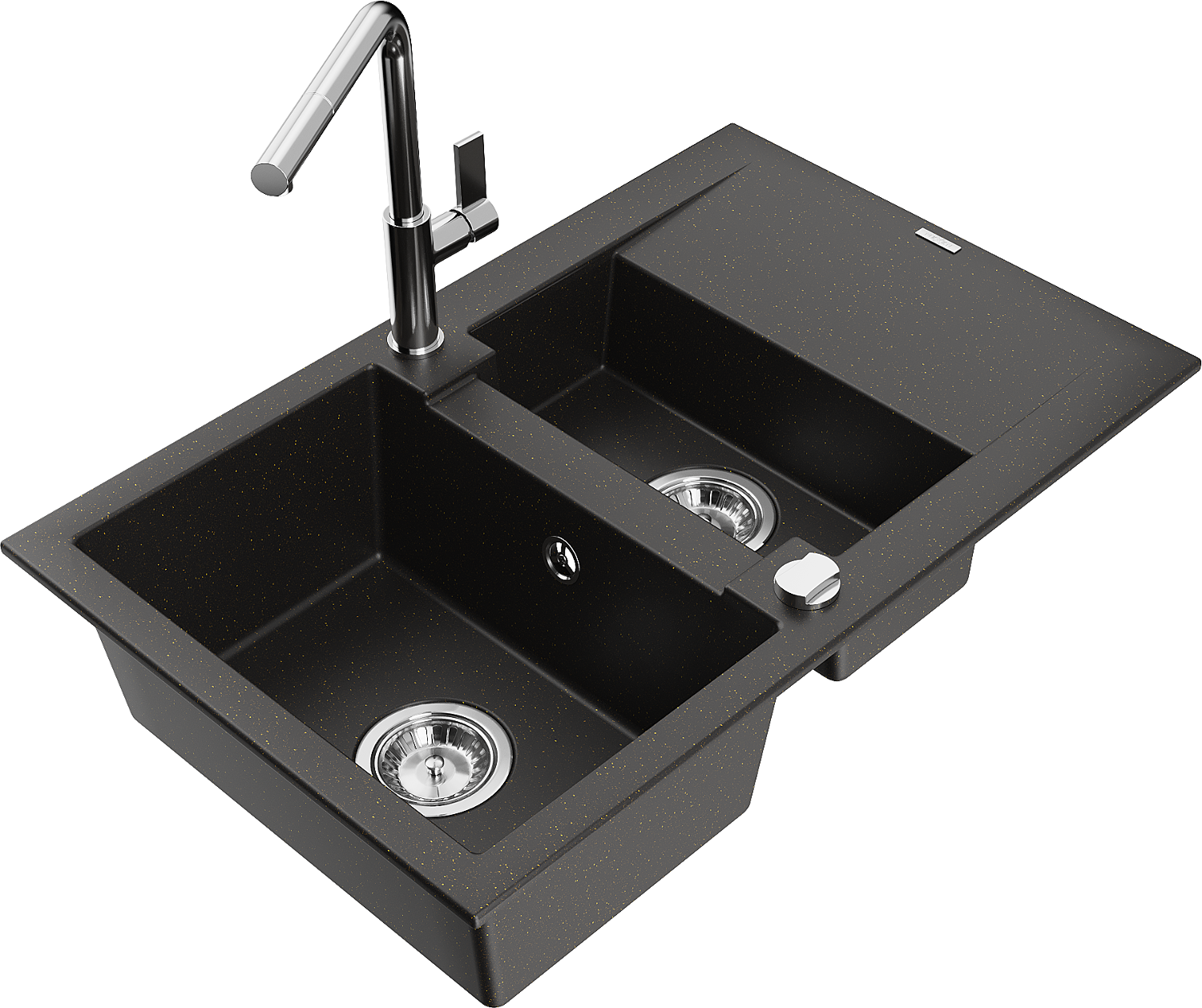 Mexen Gaspar granit izlietne ar 1,5 nodalījumu, notekas un virtuves krānu Flora, melns/zeltains metālisks - 6507-75-670401-00