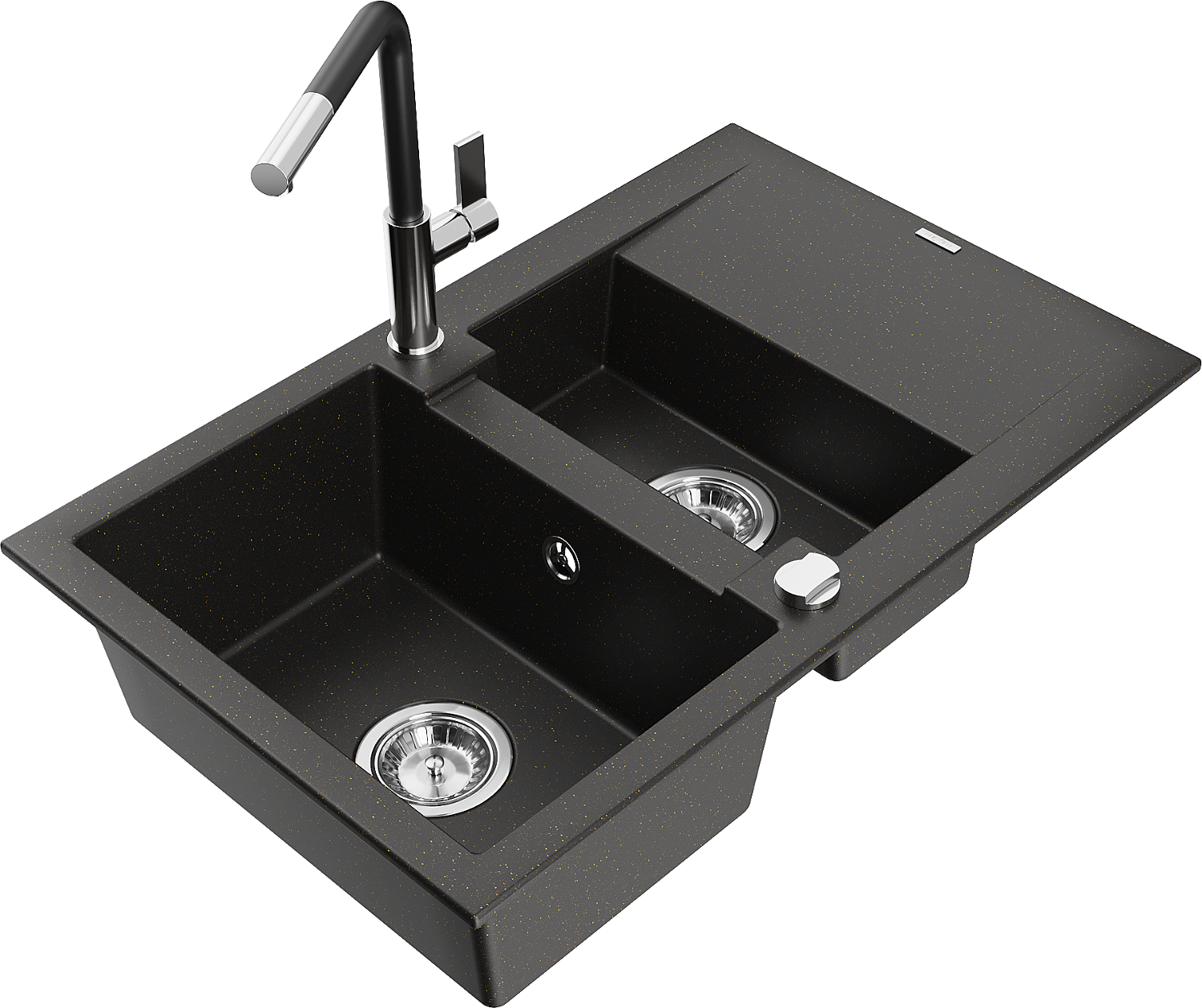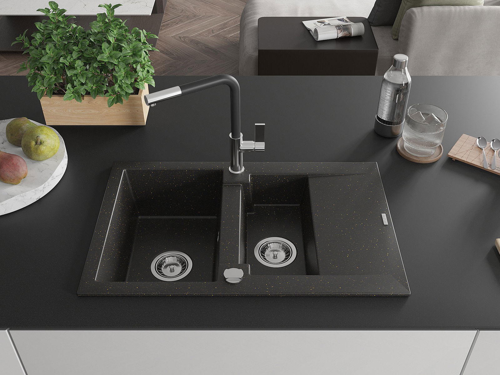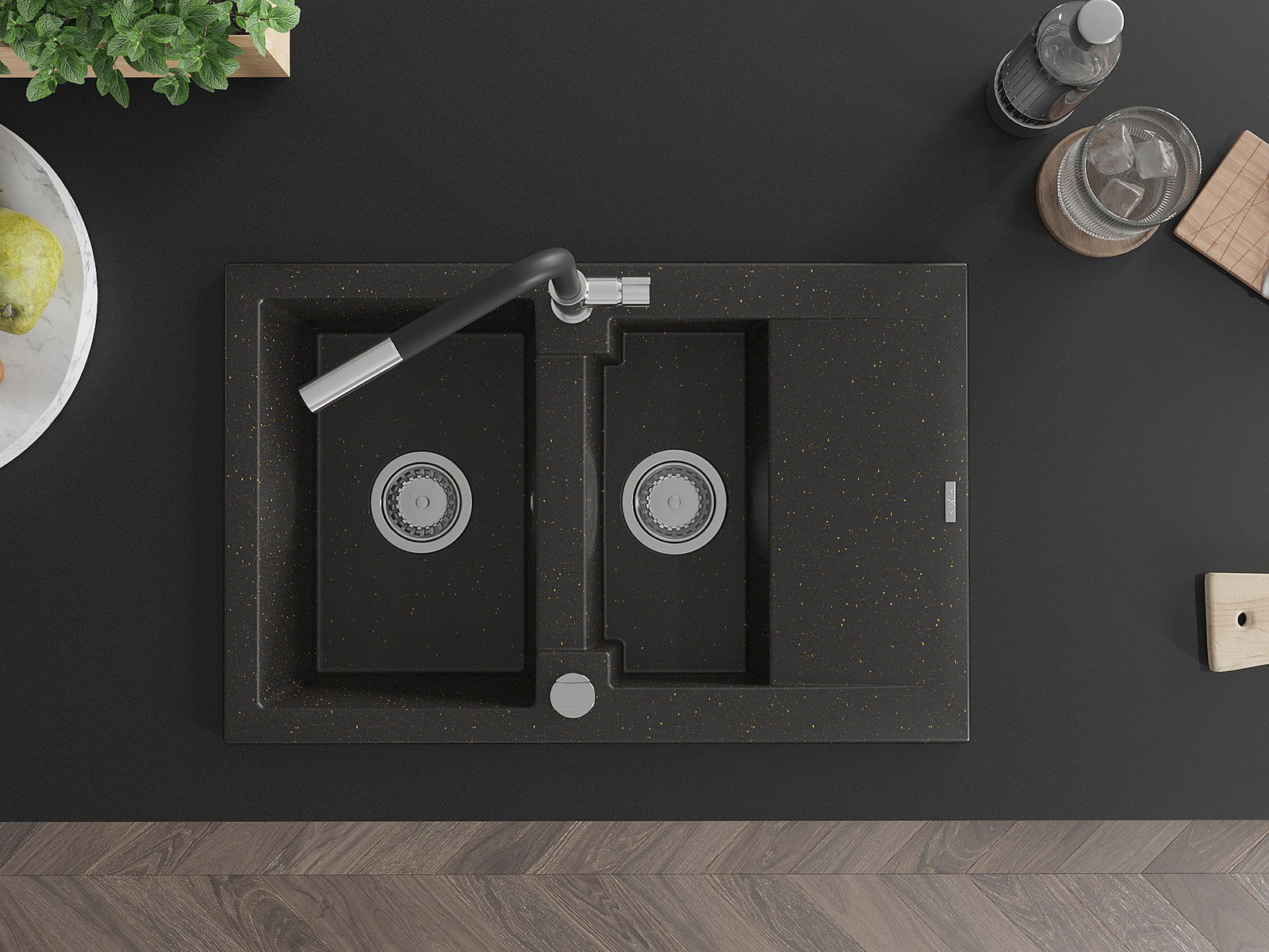 Mexen Gaspar granitizlietne 1,5 nodalīta ar noteku un Flora virtuves jaucējkrānu, melns/zeltains metālisks - 6507-75-670401-07