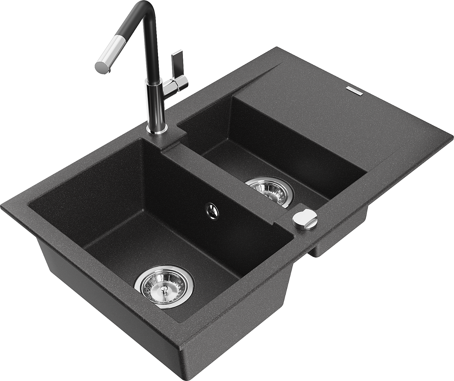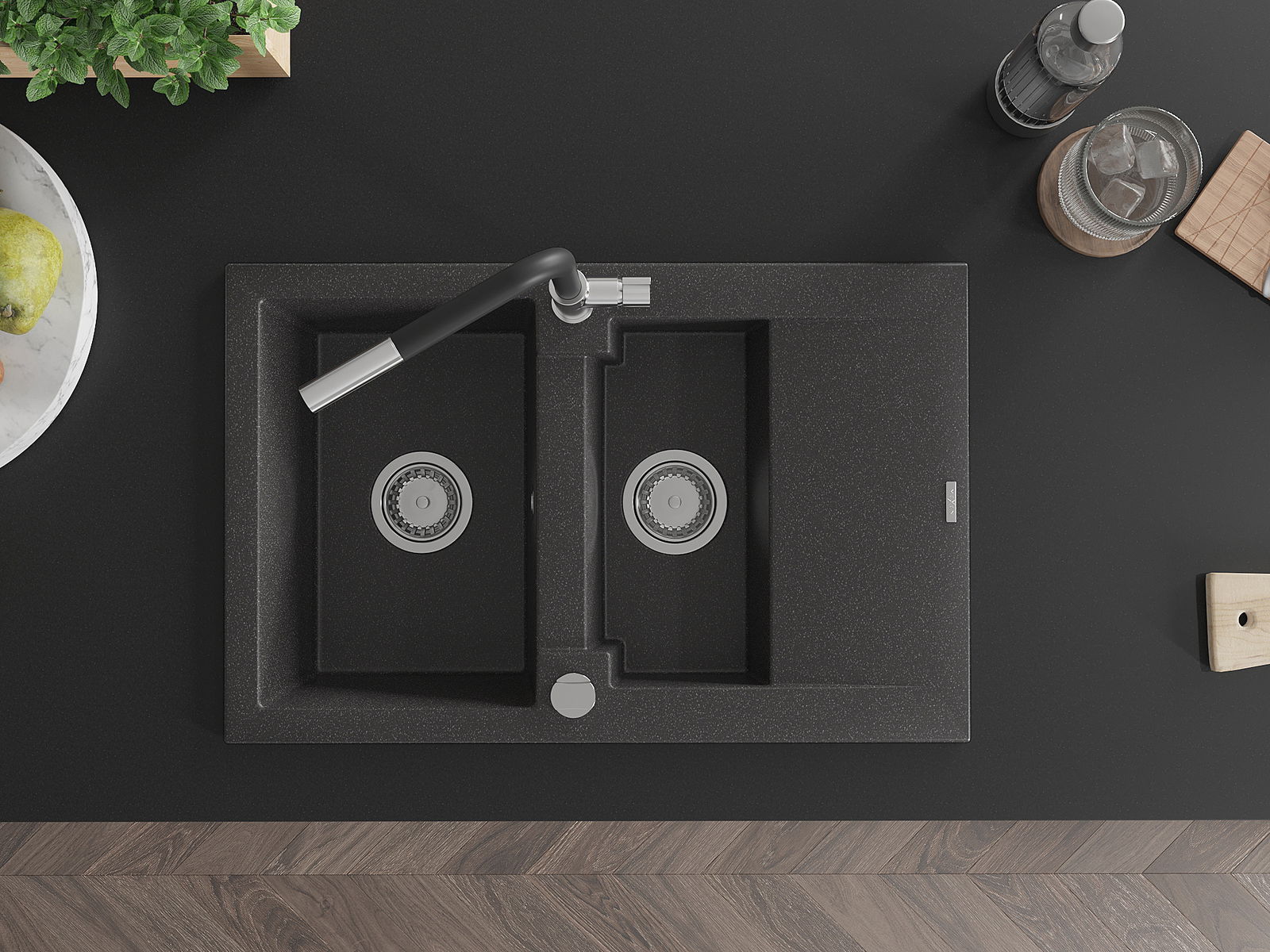 Mexen Gaspar granīta izlietne ar 1,5 nodalījumu un noteku un Flora virtuves jaucējkrānu, melna ar punktiem - 6507-76-670401-07