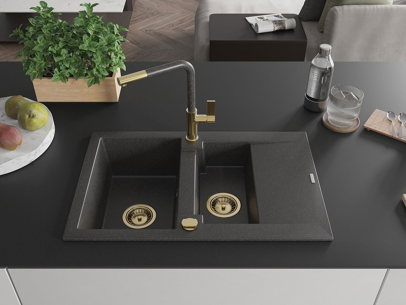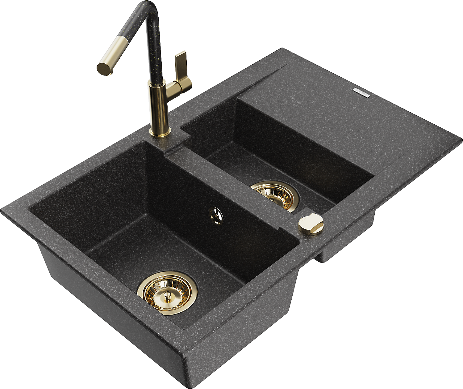Mexen Gaspar 1,5 nodalījumu granīta izlietne ar noteces virsmu un Flora virtuves jaucējkrānu, melna ar raibumu