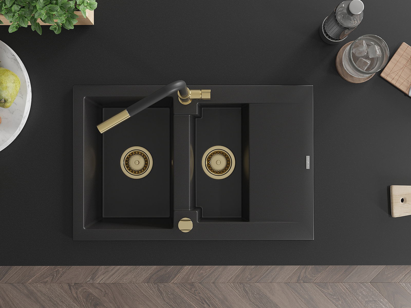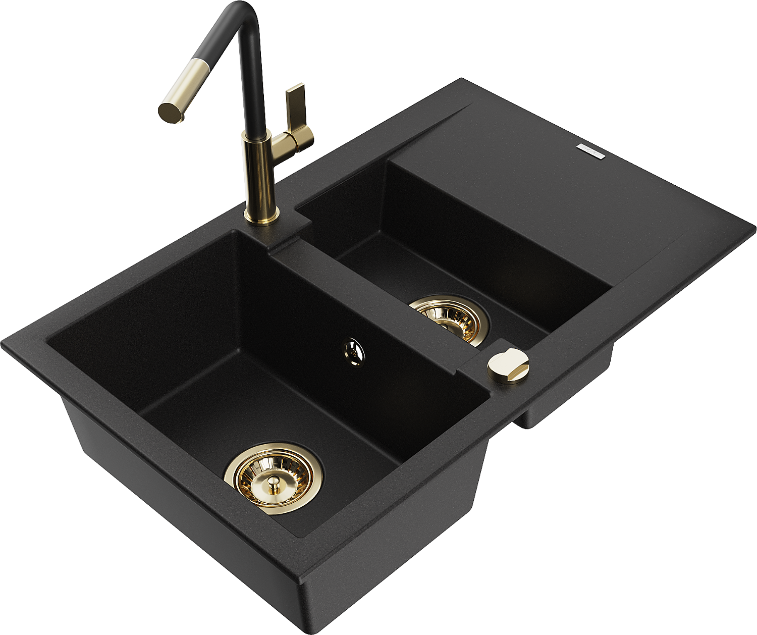 Mexen Gaspar granīta izlietne ar 1,5 nodalījumu, notekplāksni un virtuves jaucējkrānu Flora, melna - 6507-77-670401-57-G