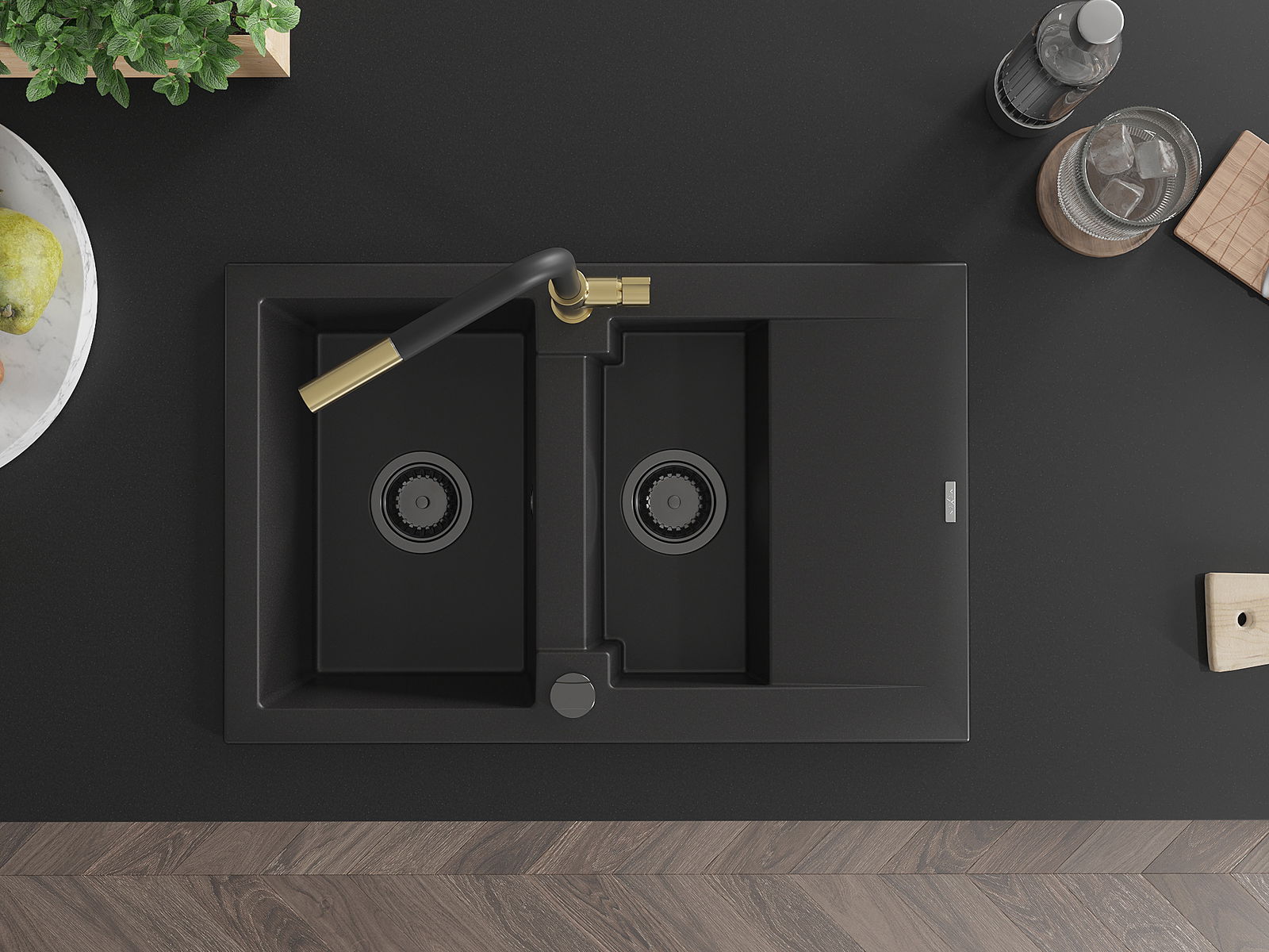 Mexen Gaspar granīta izlietne 1,5 nodalījuma ar noteces reni un virtuvēm maisītāju Flora, melna - 6507-77-670401-57-B
