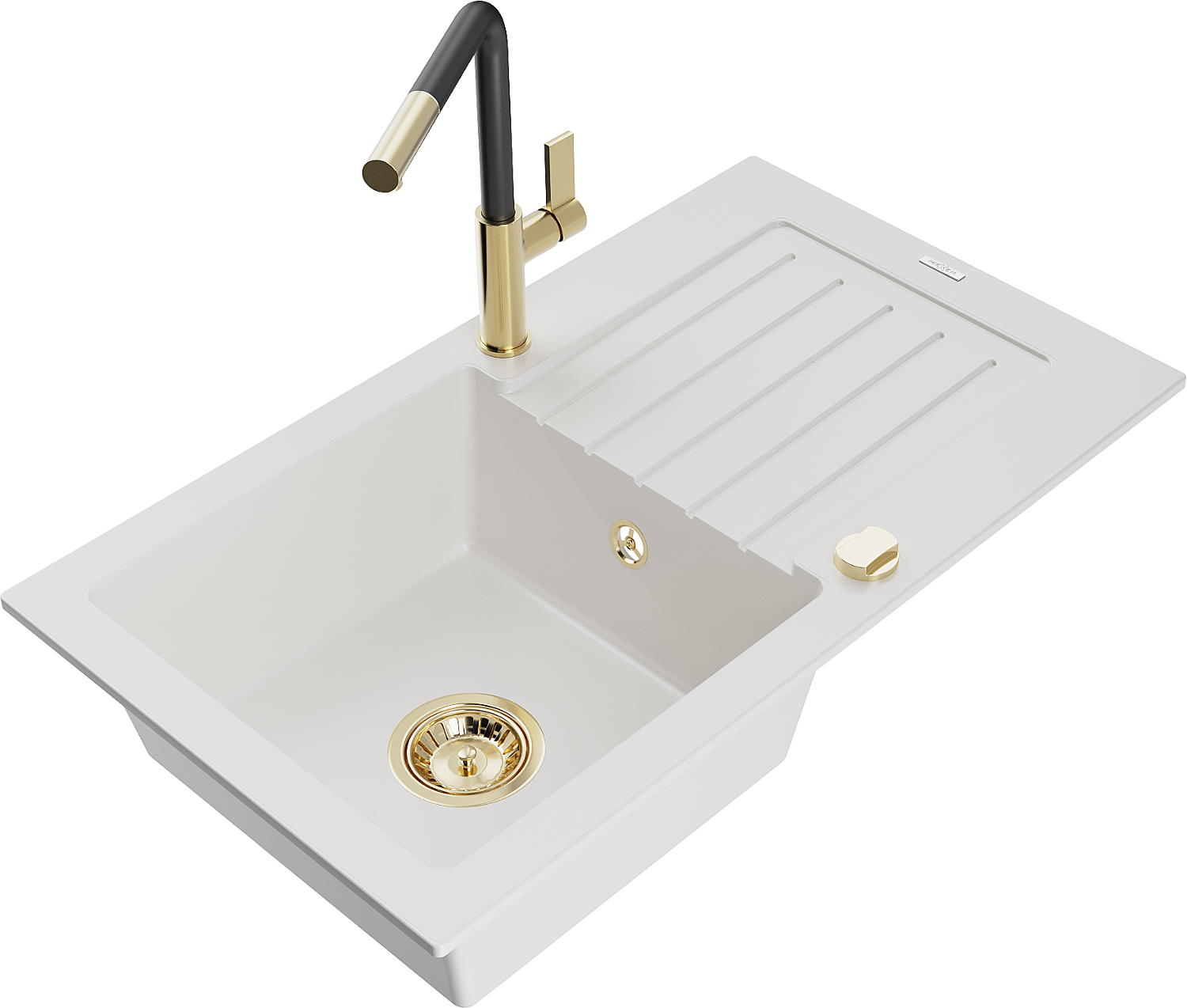 Mexen Pablo granitais izlietne ar vienu nodalījumu un noteces plāksni un virtuves jaucējkrānu Flora, balts - 6510-20-670401-57-G