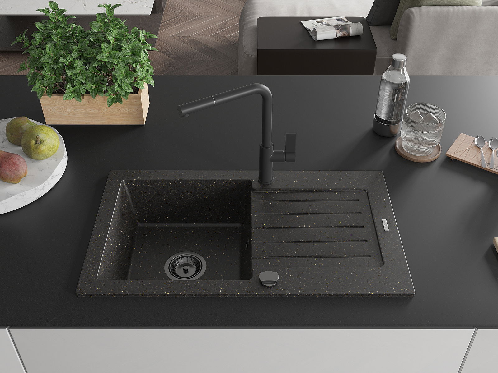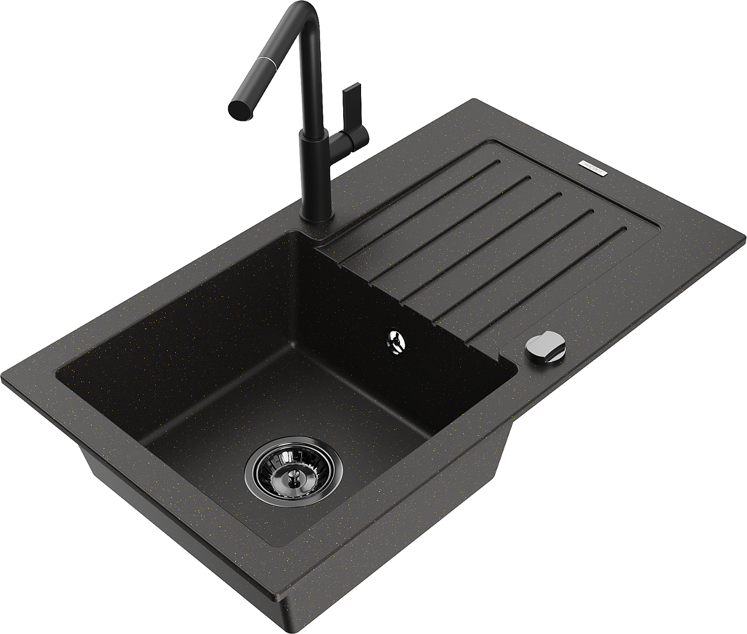 Mexen Pablo granitizlietne ar vienu nodalījumu, ar notecinātāju un virtuves jaucējkrānu Flora, melns/zeltains metālisks