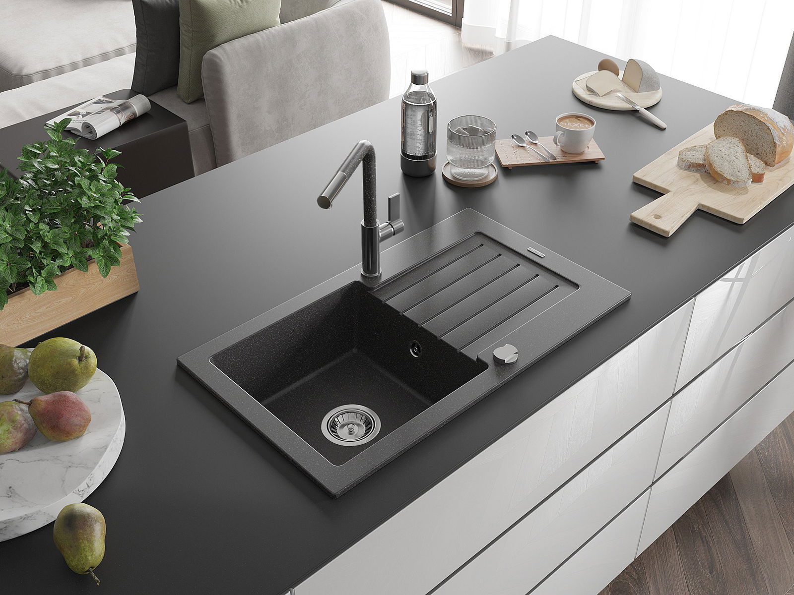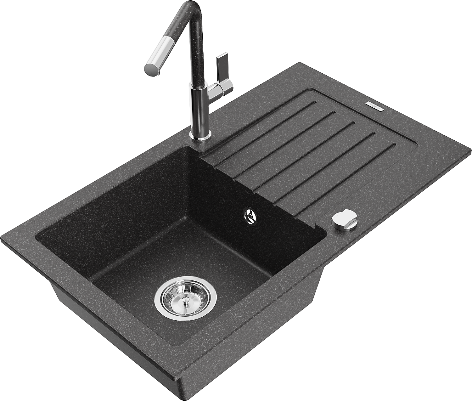 Mexen Pablo grānīta izlietne ar vienu nodalījumu, notecētāju un Flora virtuves jaucējkrānu, melna ar plankumiem