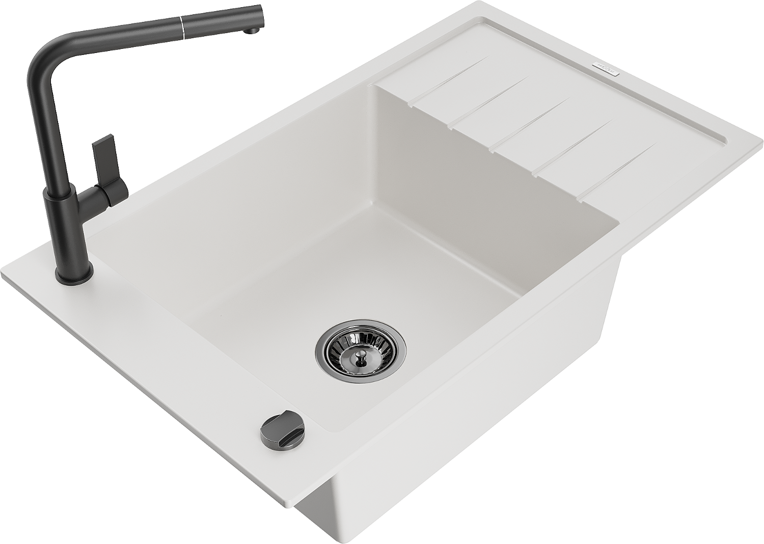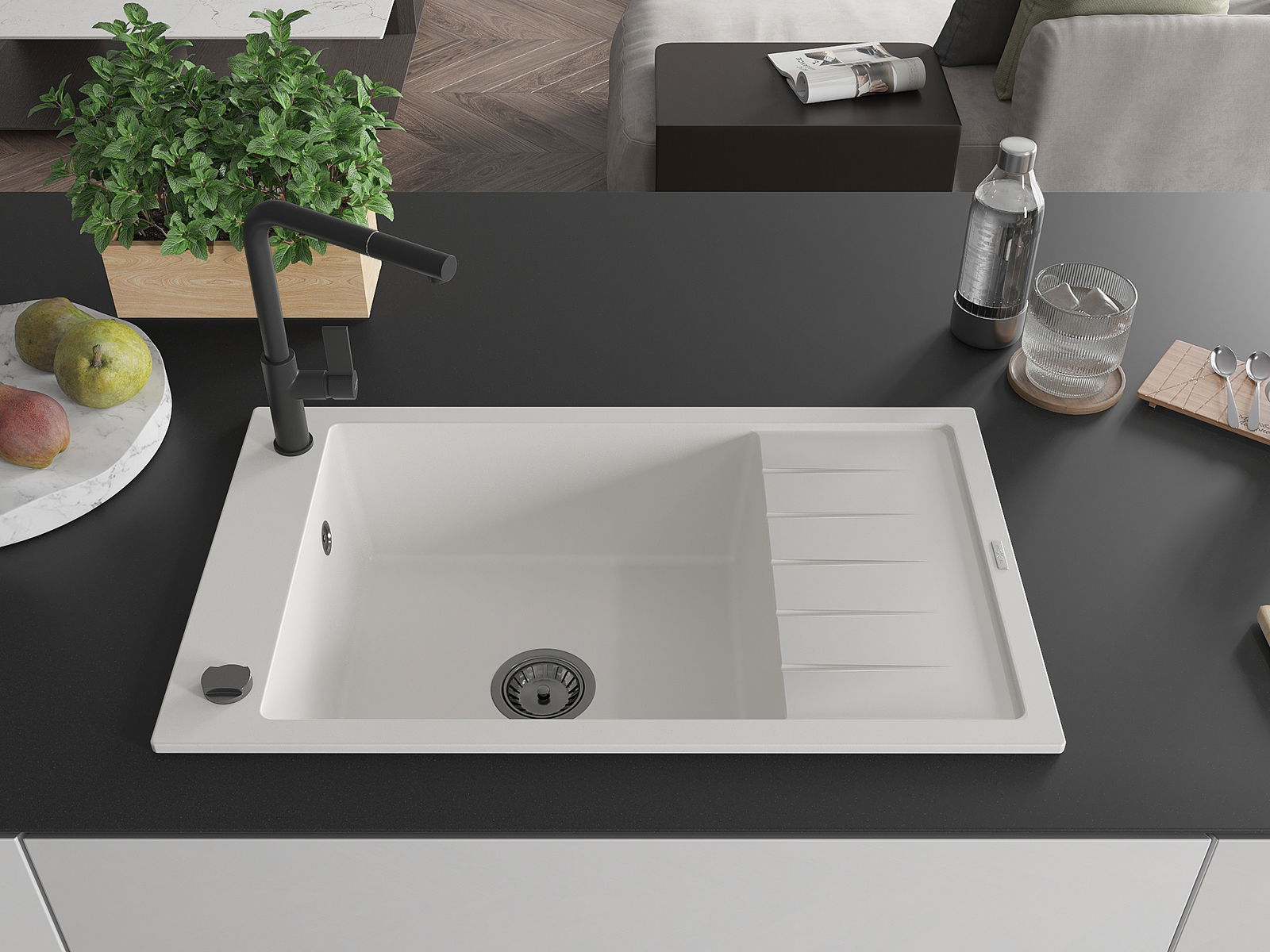 Mexen Elias granitā izlietne ar vienu nodalījumu, ar žāvētāju un virtuves jaucējkrānu Flora, balta - 6511-20-670401-70-B