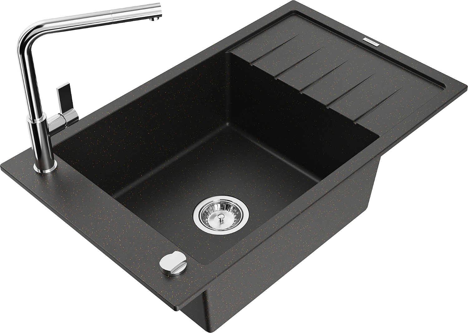 Mexen Elias granitizlietne ar vienu nodalījumu ar noteces vietu un virtuves jaucējkrānu Flora, melns/zeltains metālisks
