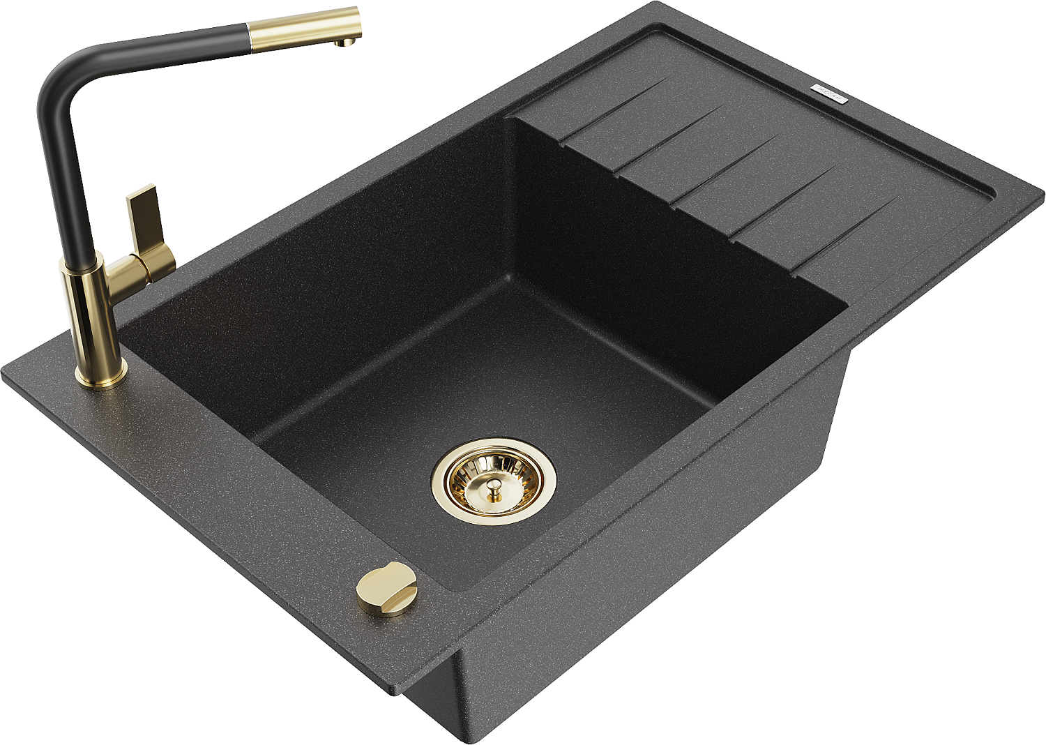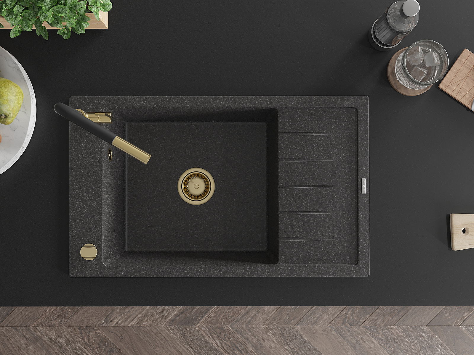 Mexen Elias granitizlietne 1-kameras izlietne ar noteku un virtuves jaucējkrānu Flora, melna ar punktiem - 6511-76-670401-57-G