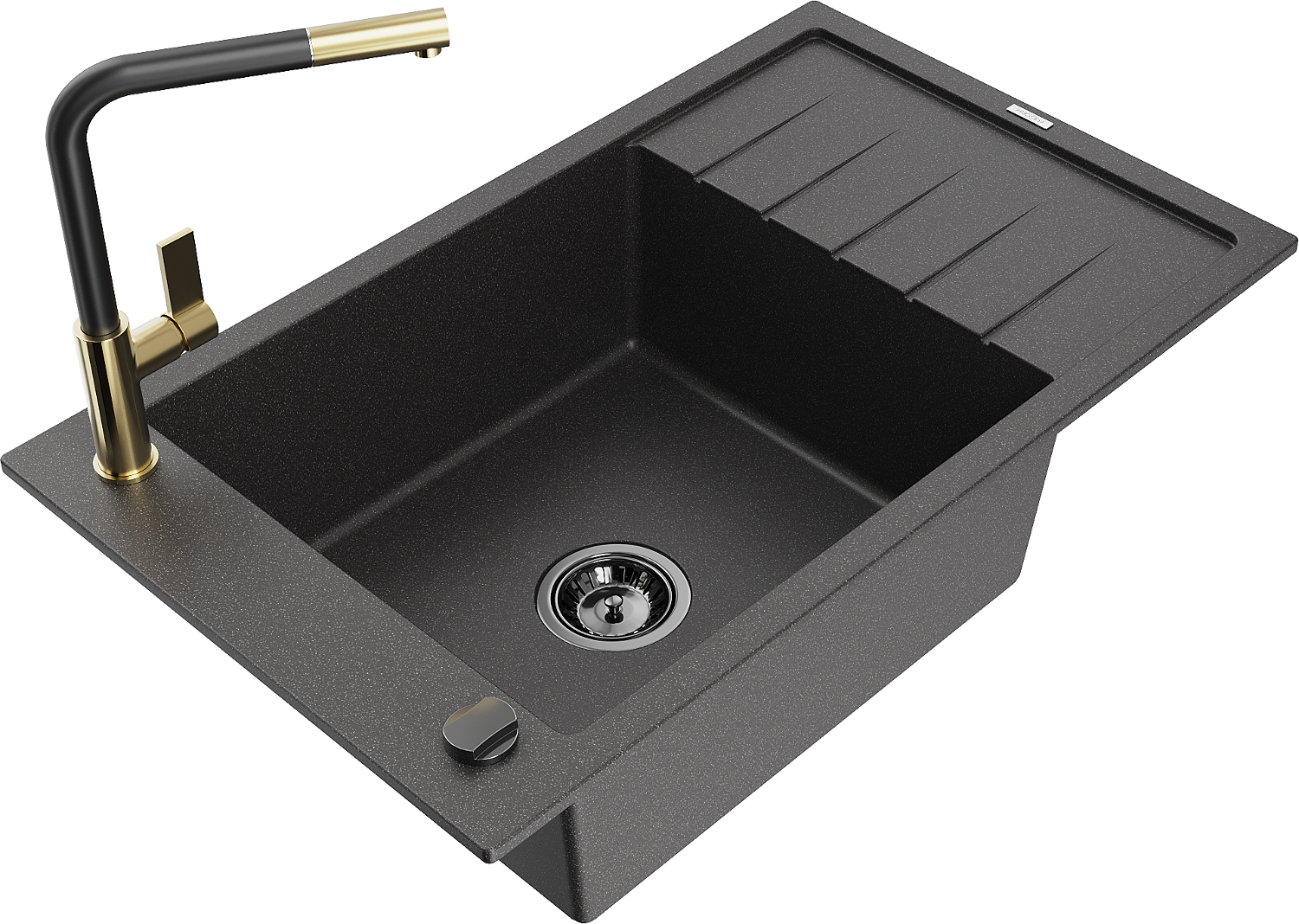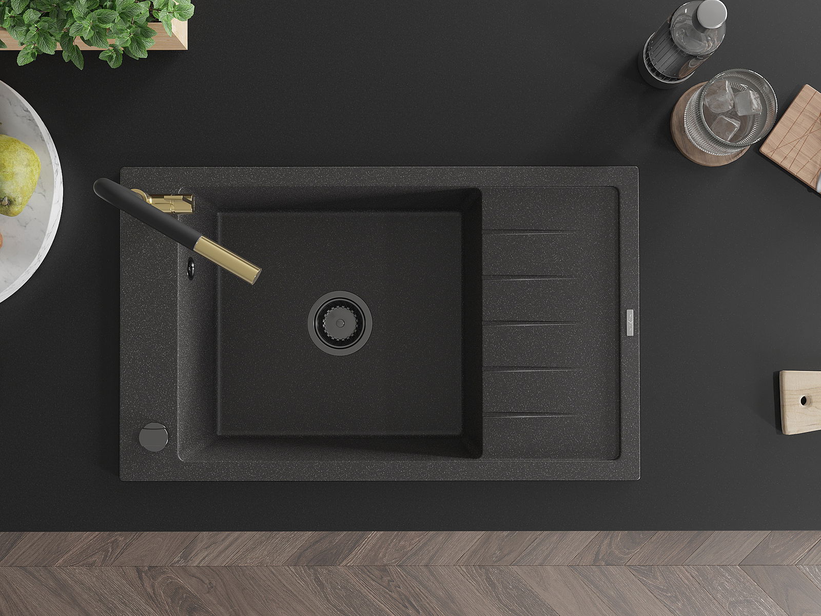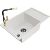 Mexen Elias granitizlietne izlietne ar vienu nodalījumu un noteces virsmu un virtuves jaucējkrānu Flora, melna ar šļakatām