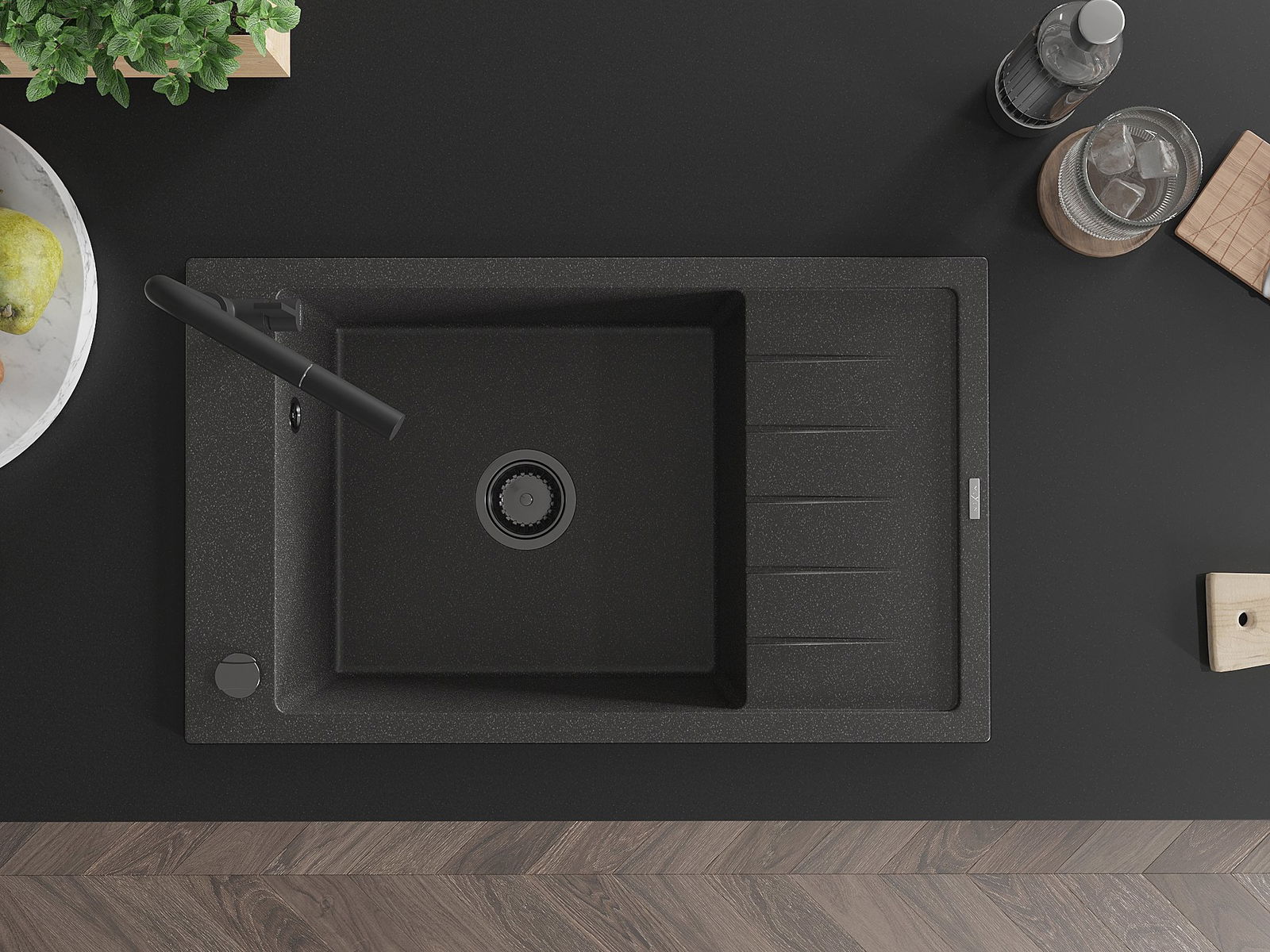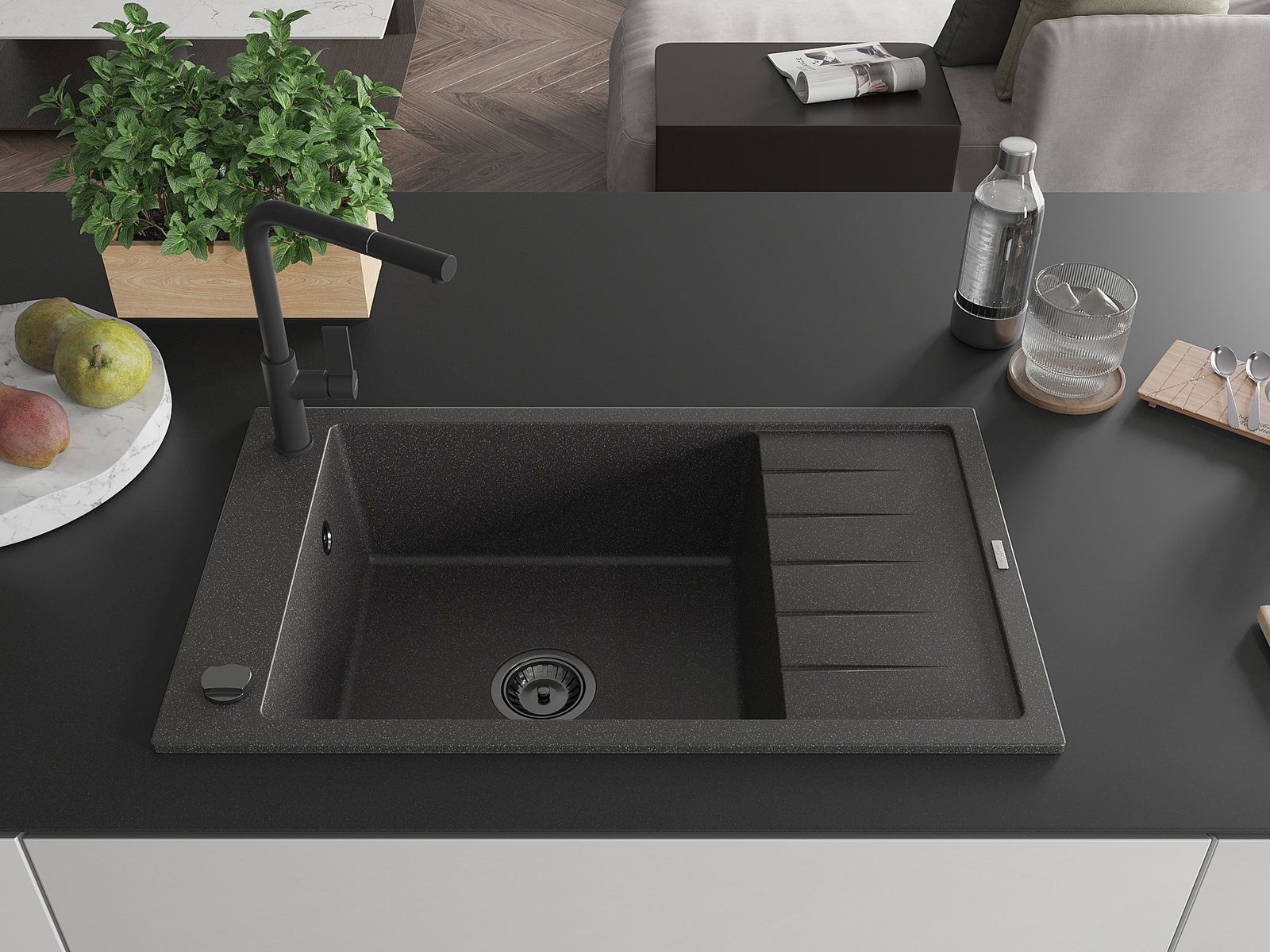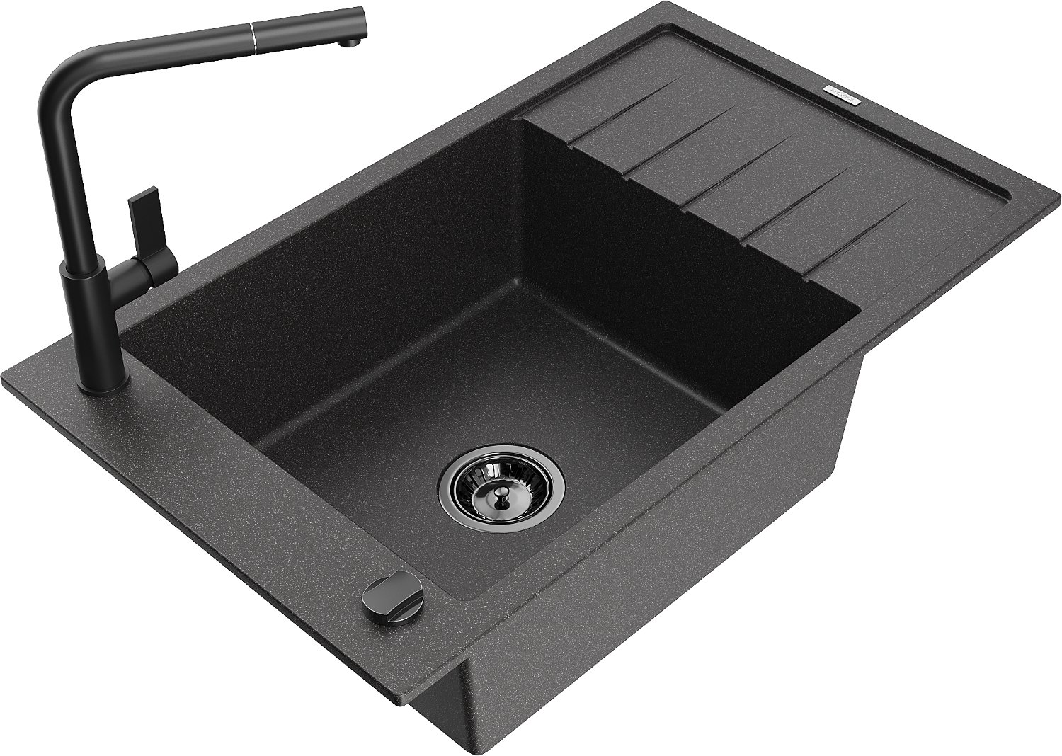 Mexen Elias grants izlietne ar vienu nodalījumu, notekplauktu un Flora virtuves jaucējkrānu, melna ar raibumiem