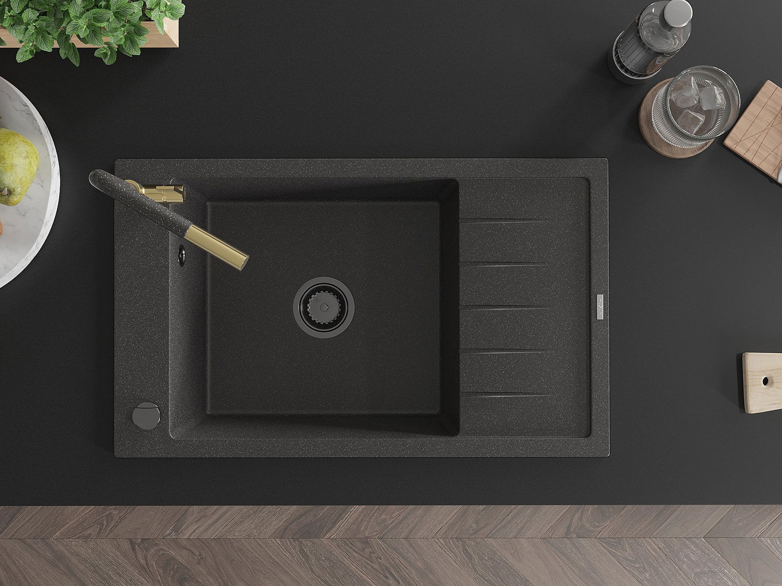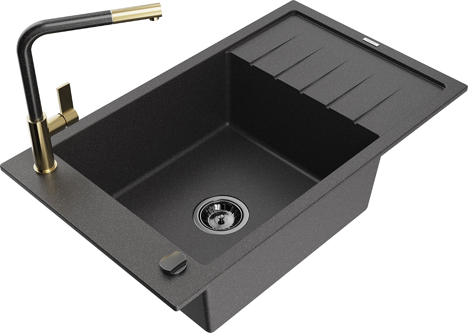 Mexen Elias granitizlietne izlietne ar vienu nodalījumu, notecinātāju un virtuves krānu Flora, melns plankumains