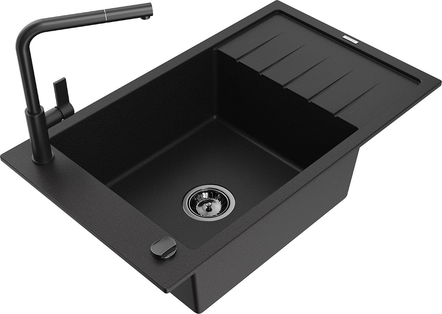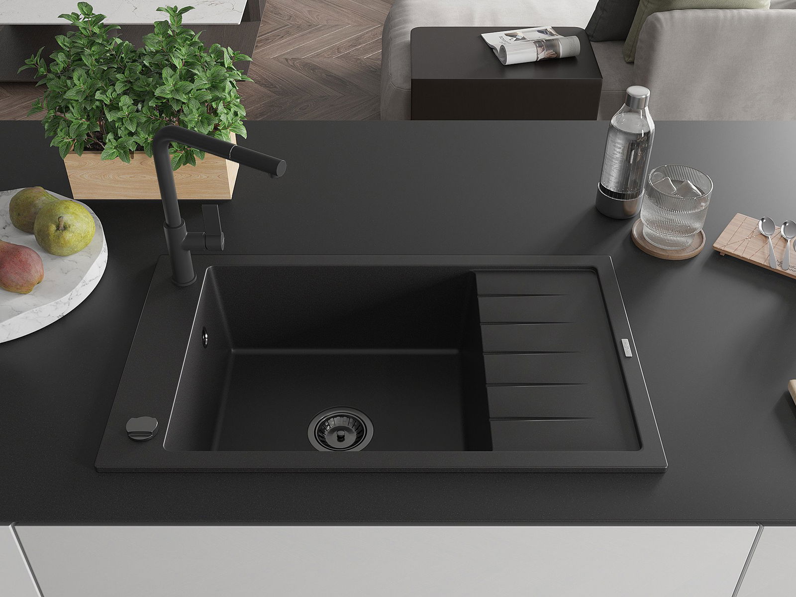 Mexen Elias granitā izlietne ar vienu nodalījumu, ar novadni un virtuves jaucējkrānu Flora, melna - 6511-77-670401-70-B