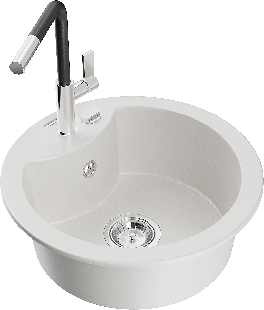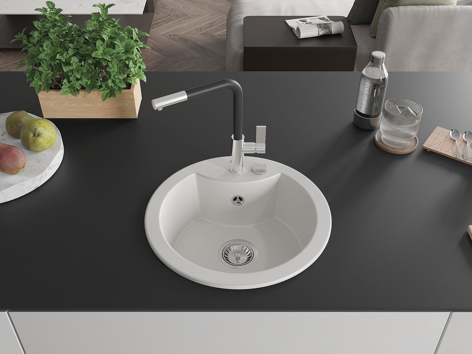 Mexen Diego granit izlietne ar 1 nodalījumu un Flora virtuves jaucējkrānu, balta - 6512-20-670401-07