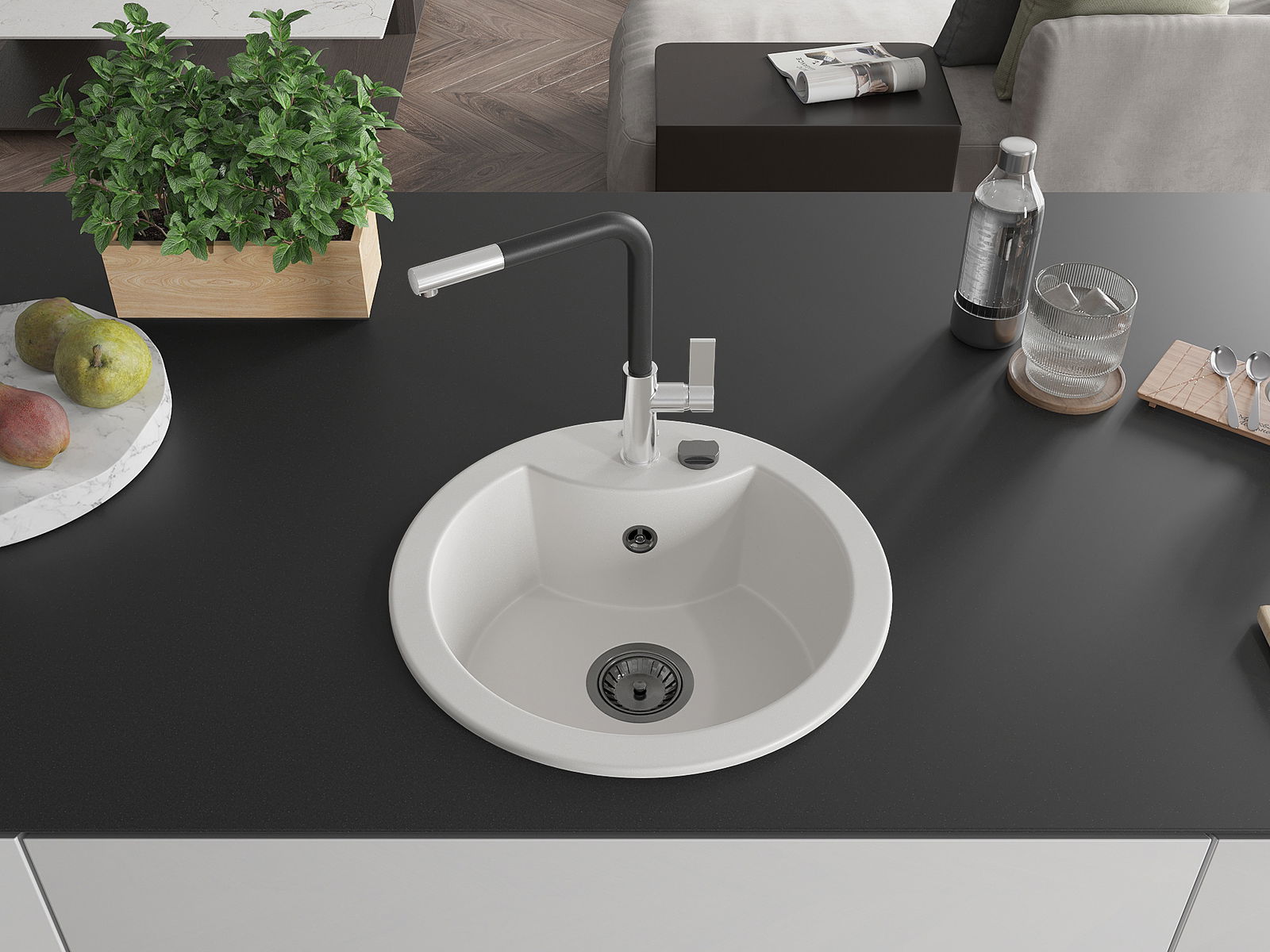 Mexen Diego granitā izlietne ar 1 nodalījumu un virtuves jaucējkrānu Flora, balta - 6512-20-670401-07-B