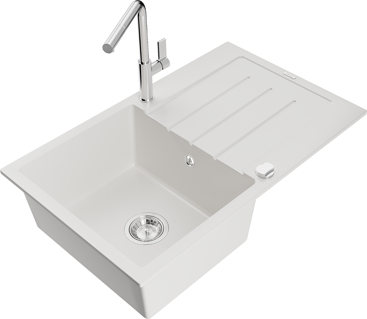 Mexen Bruno granitizlietne ar vienu nodalījumu ar notecinātāju un virtuves jaucējkrānu Flora, balts - 6513-20-670401-00