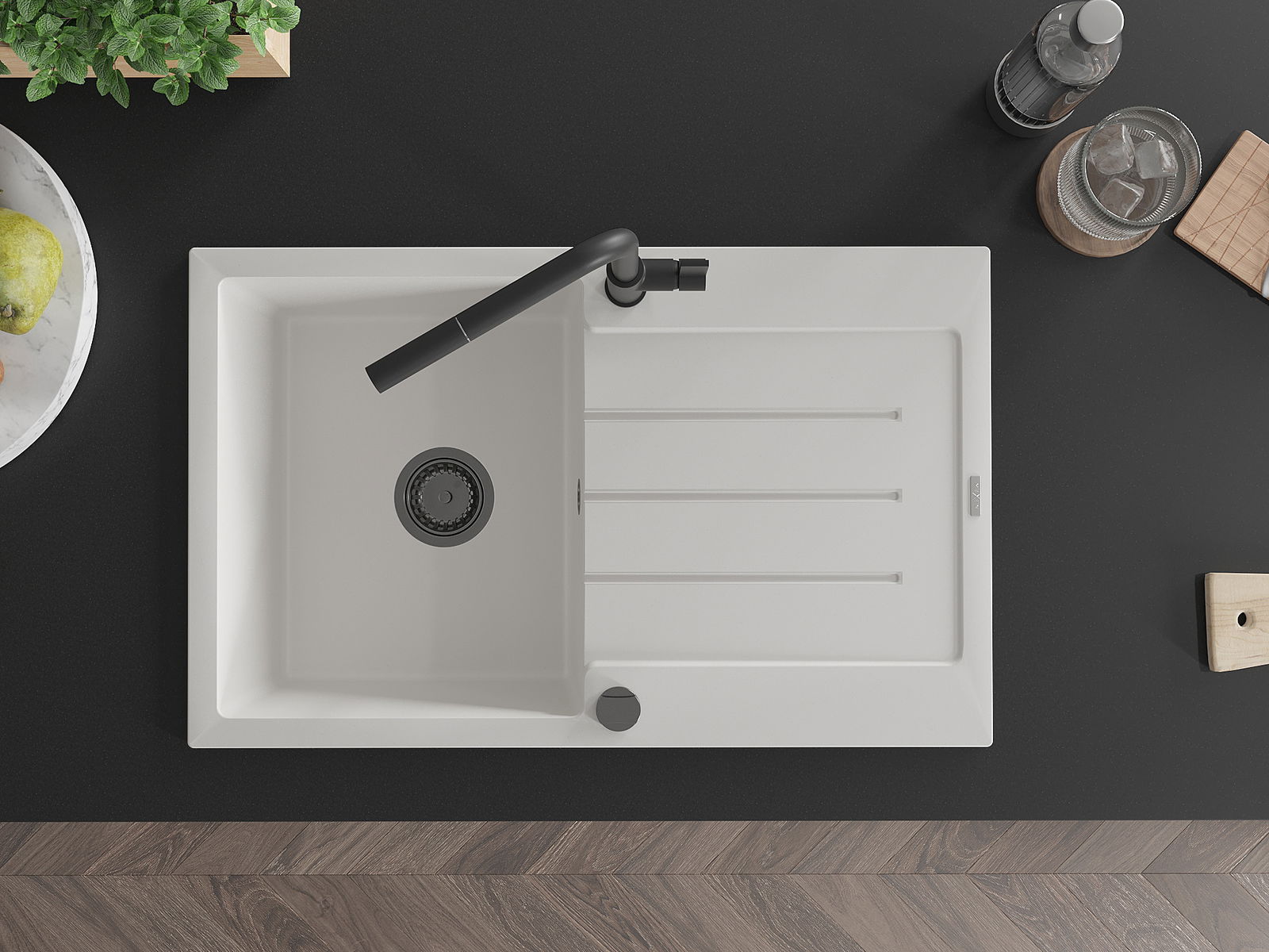 Mexen Bruno granitizlietnes krāns ar vienu nodalījumu, noteku un Flora virtuves jaucējkrānu, balts - 6513-20-670401-70-B