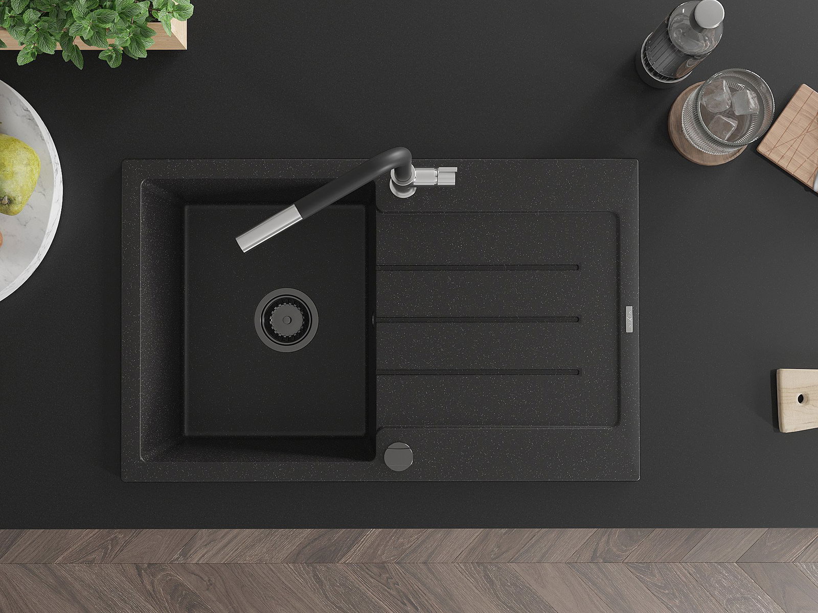 Mexen Bruno granit izlietne ar vienu nodalījumu un noteku un virtuves jaucējkrānu Flora, melns/sudraba metālisks