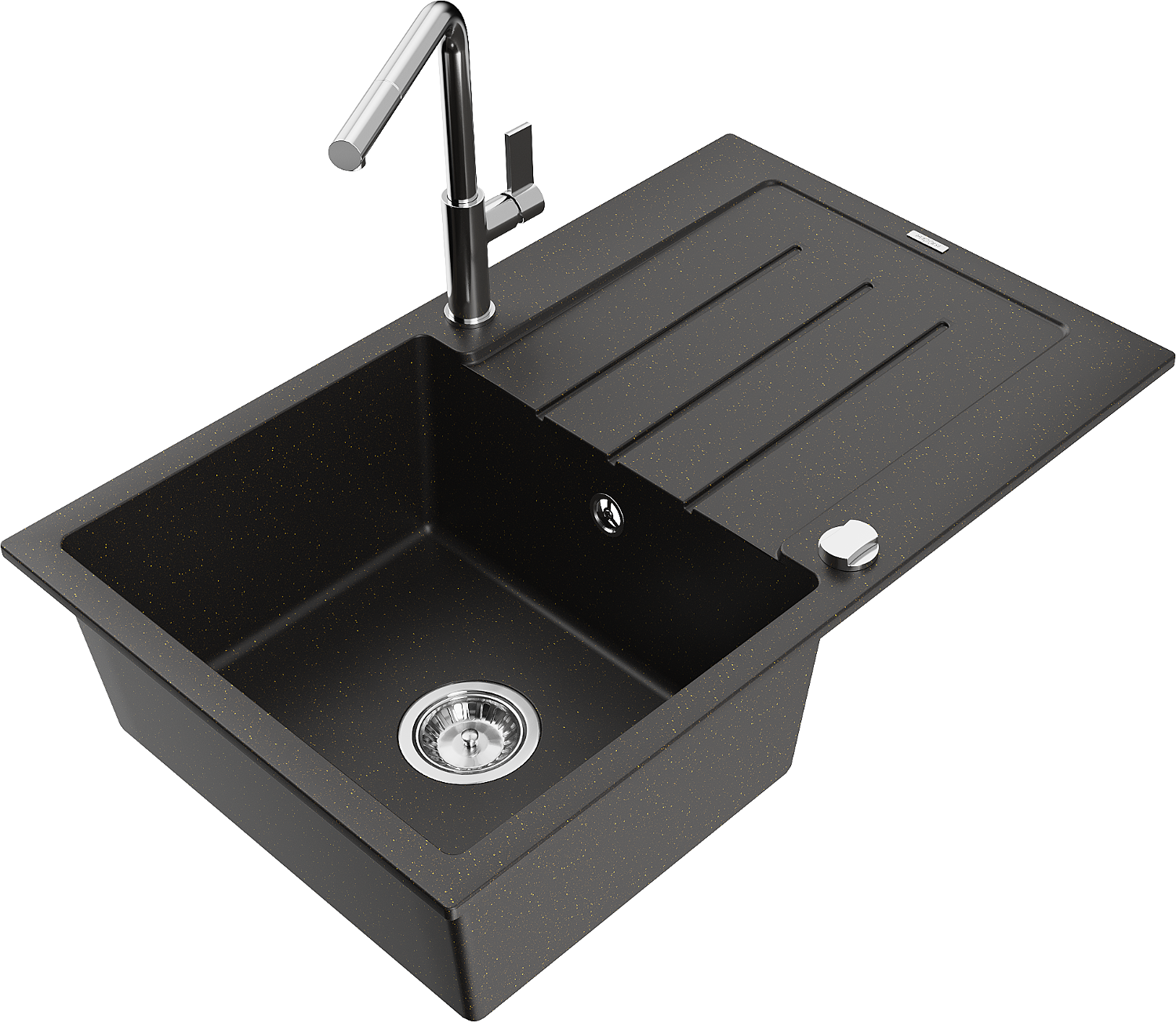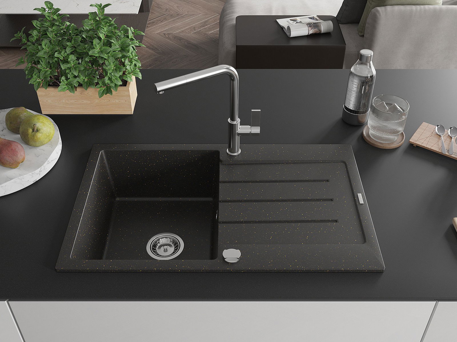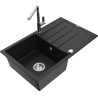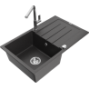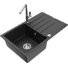 Mexen Bruno granīta izlietne ar vienu nodalījumu, ar noteku un virtuves jaucējkrānu Flora, melna/zeltaina metālika