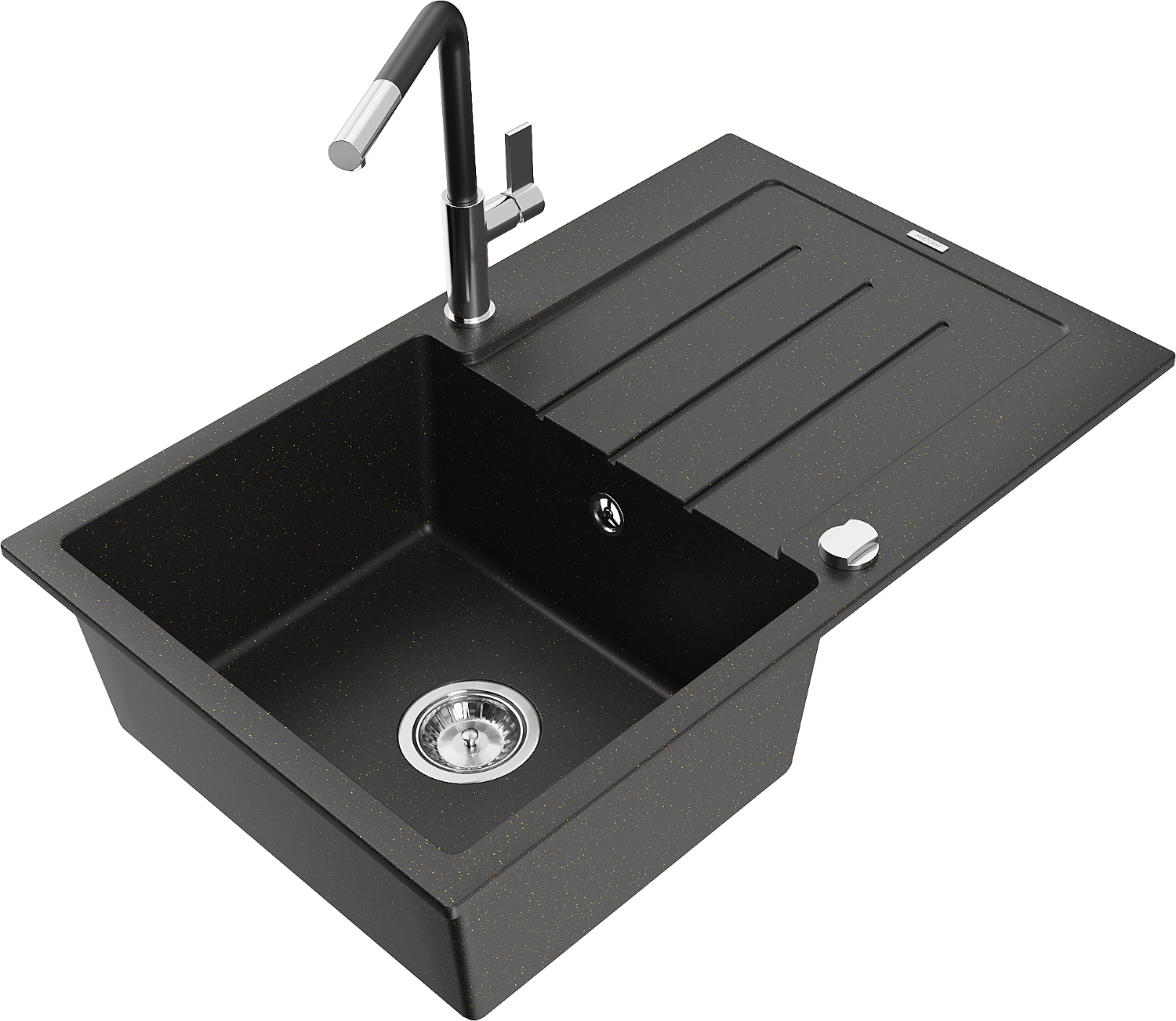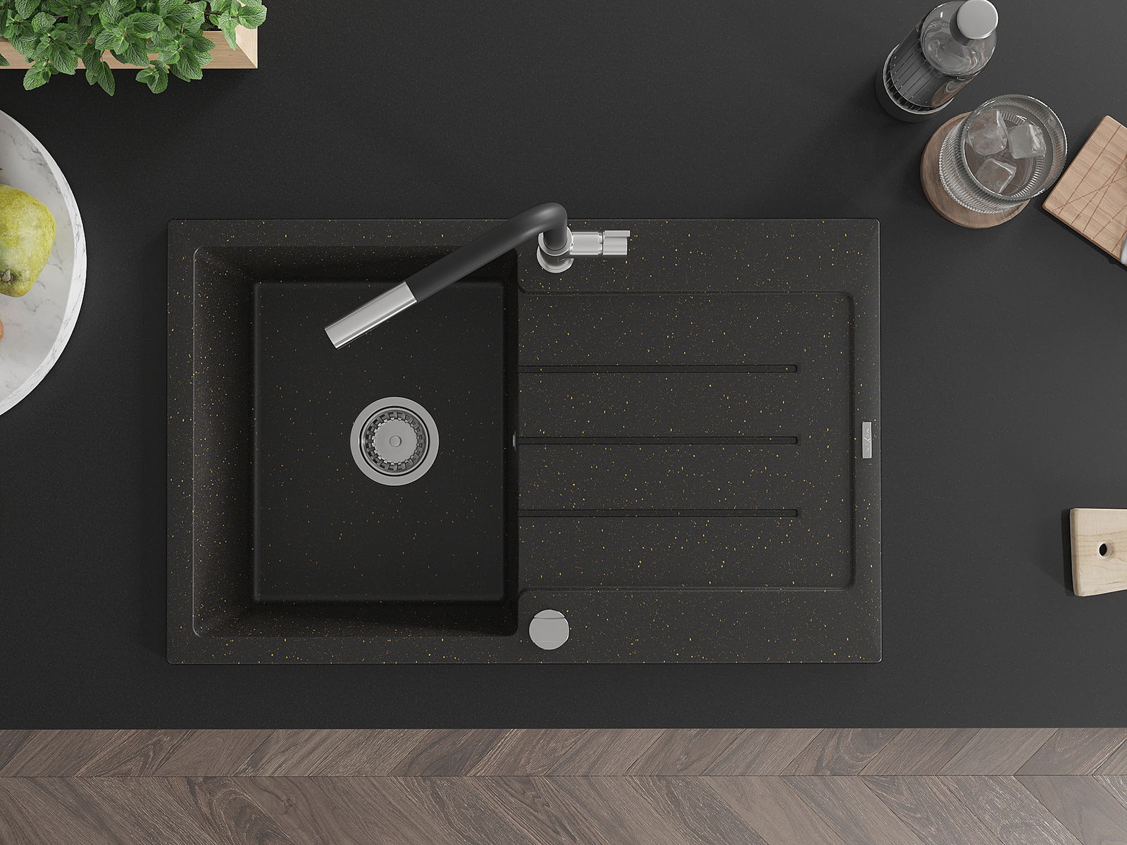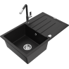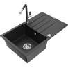 Mexen Bruno granitā izlietne ar vienu nodalījumu un noteci, ar Flora virtuves jaucējkrānu, melns/zeltains metālika