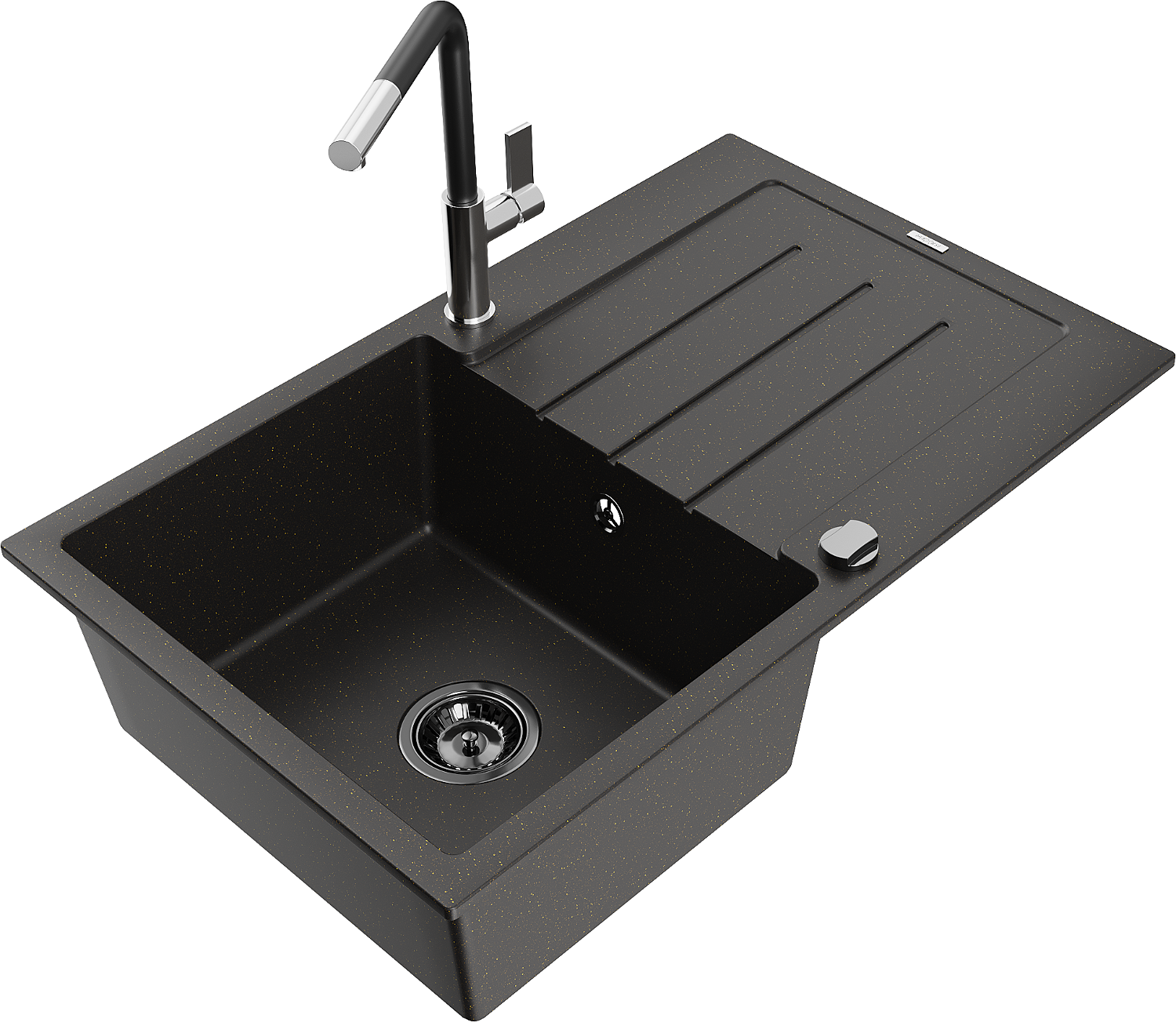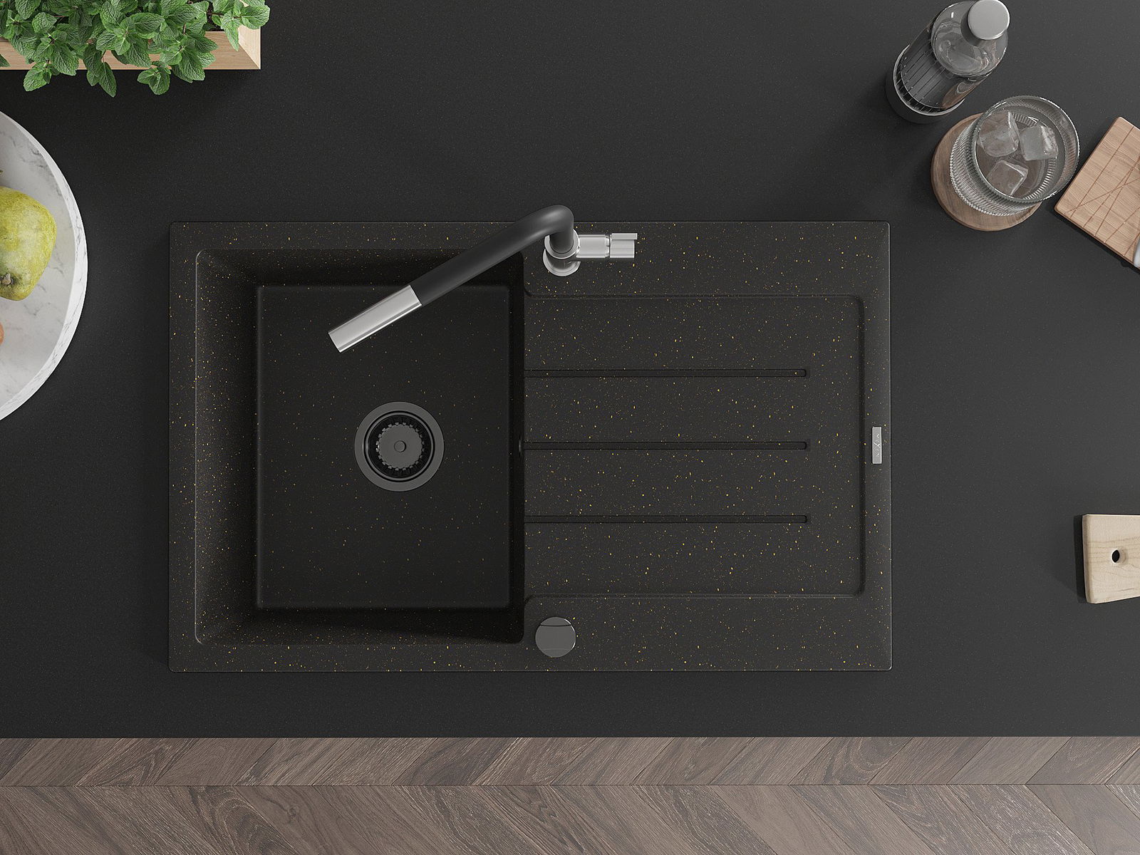 Mexen Bruno granitā izlietne ar vienu nodalījumu, noteces vietu un virtuves jaucējkrānu Flora, melns/zelta metālisks