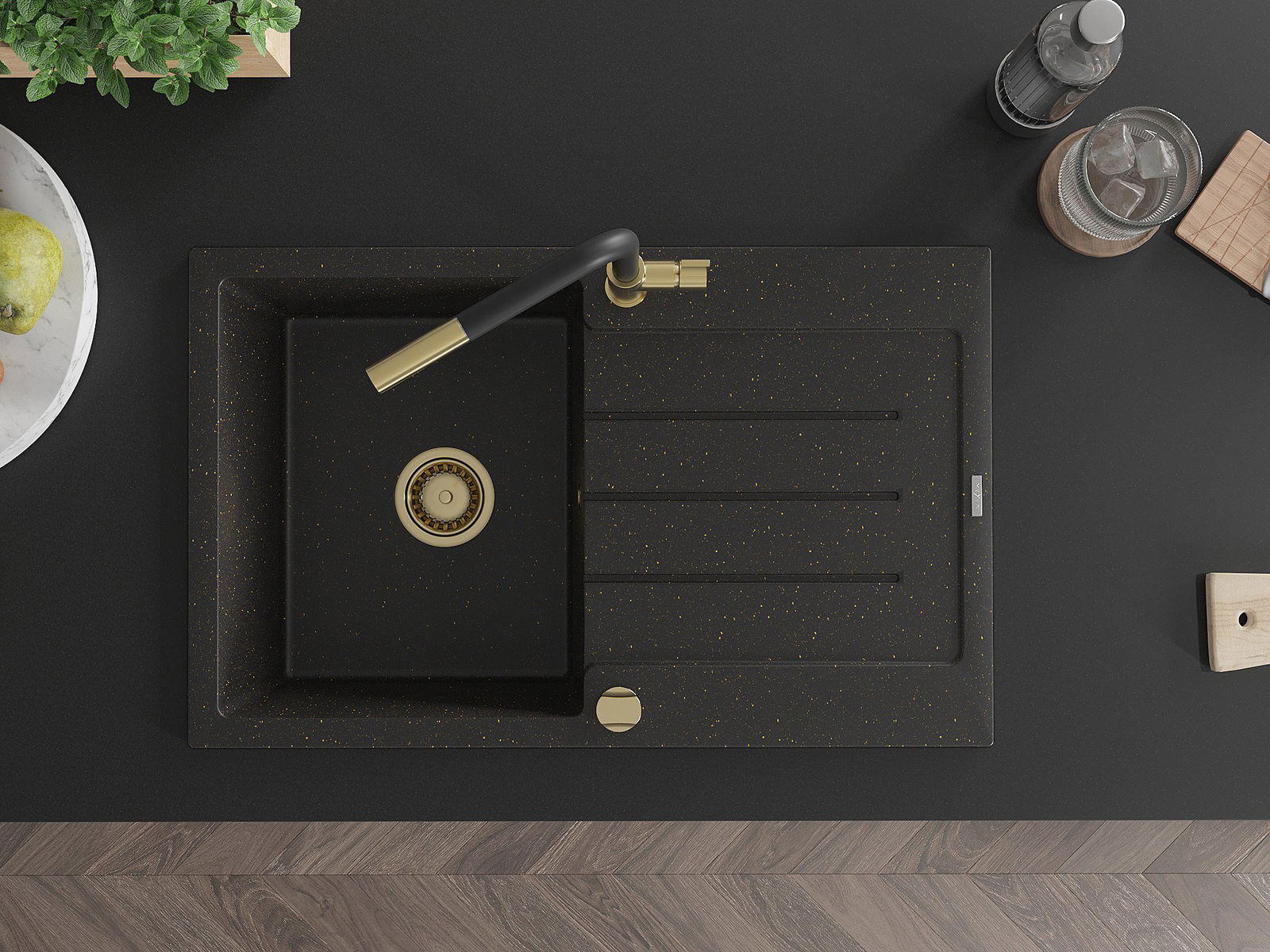 Mexen Bruno vienas granīta izlietne ar tekni un virtuves jaucējkrānu Flora, melna/zelta metālika - 6513-75-670401-57-G