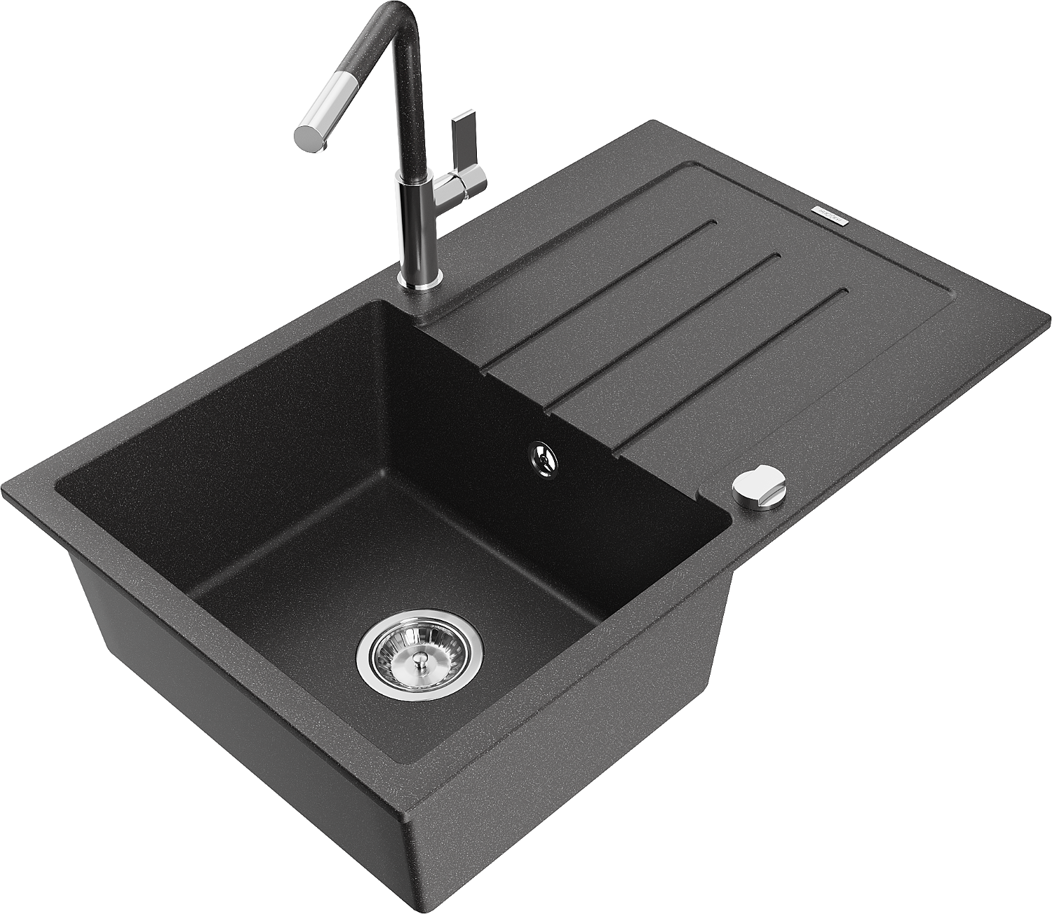 Mexen Bruno granīta izlietne ar 1 nodalījumu, noteces virsmu un Flora virtuves jaucējkrānu, melna ražota - 6513-76-670401-08