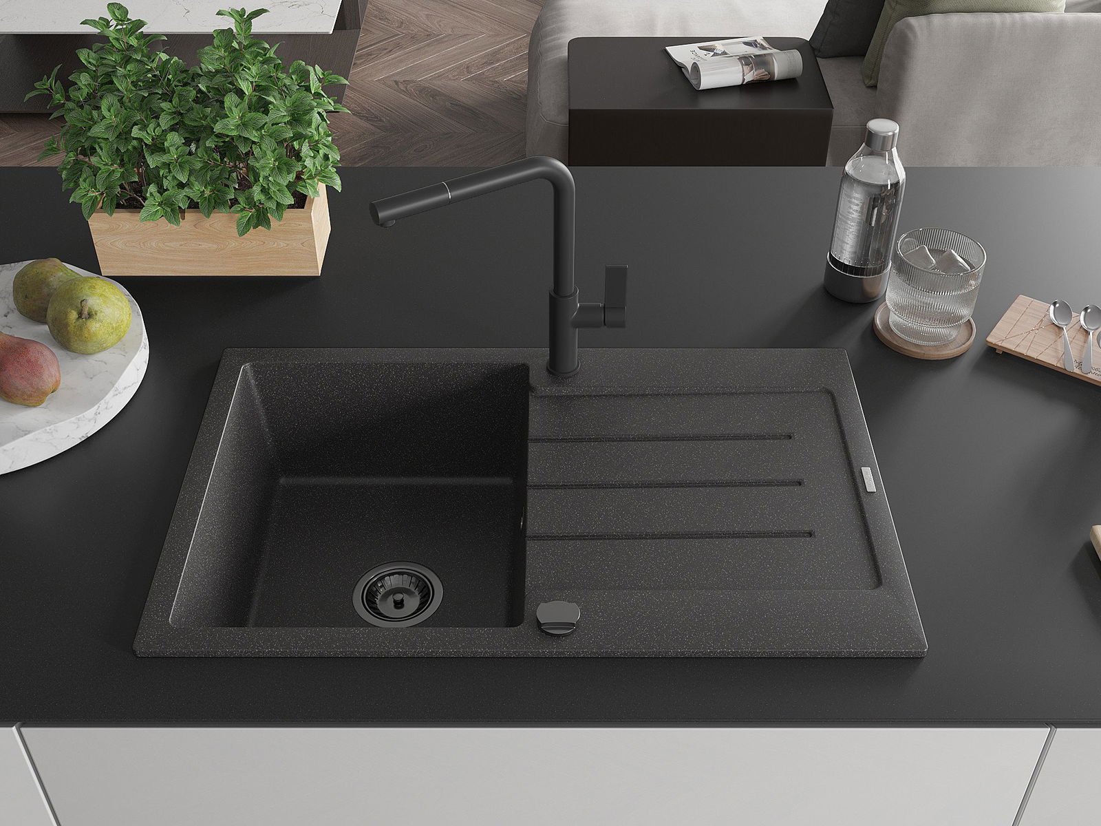 Mexen Bruno granīta izlietne ar vienu nodalījumu ar notekas un virtuves jaucējs Flora, melns punktots - 6513-76-670401-70-B