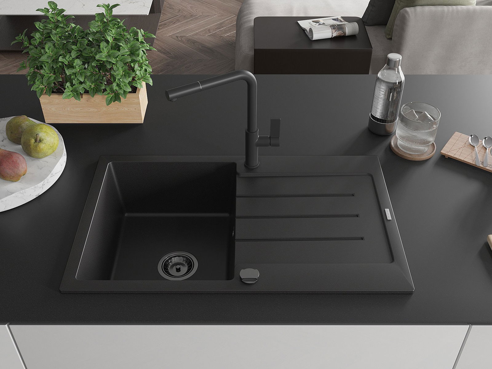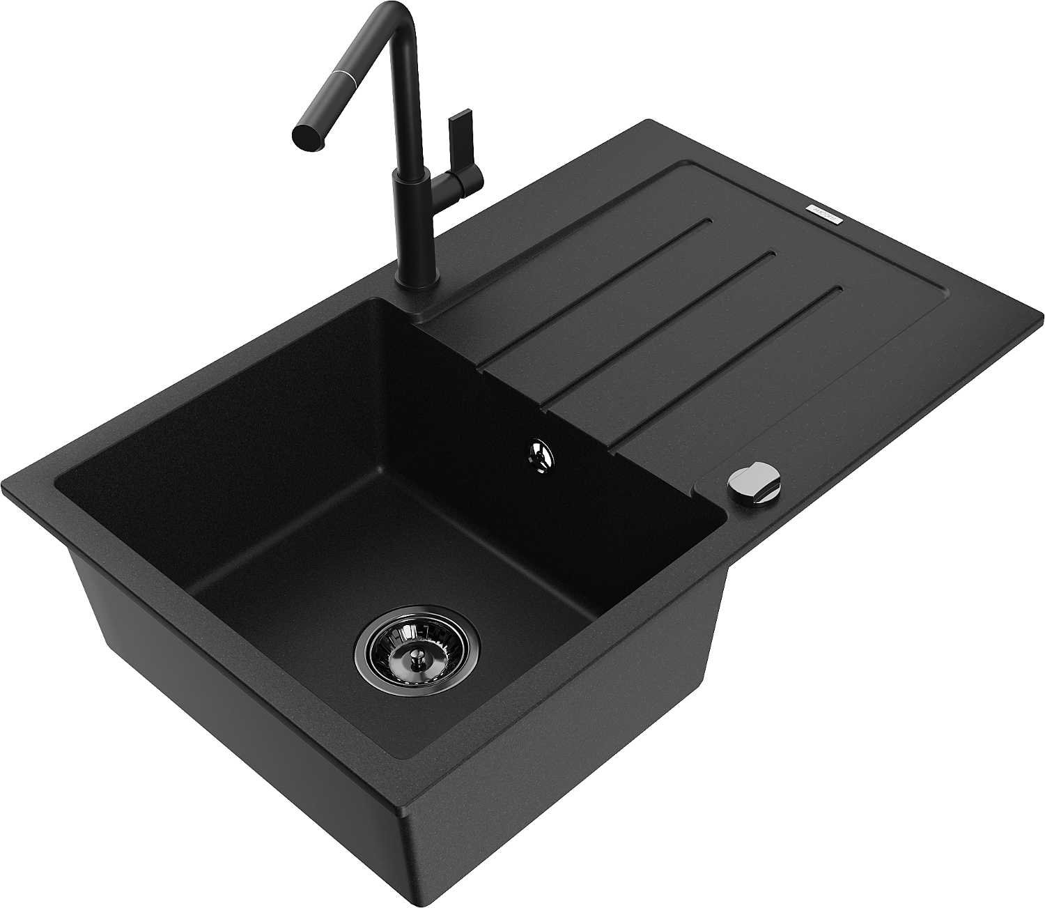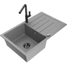 Mexen Bruno granīta izlietne ar vienu nodalījumu ar noteku un virtuves jaucējkrānu Flora, melna - 6513-77-670401-70-B