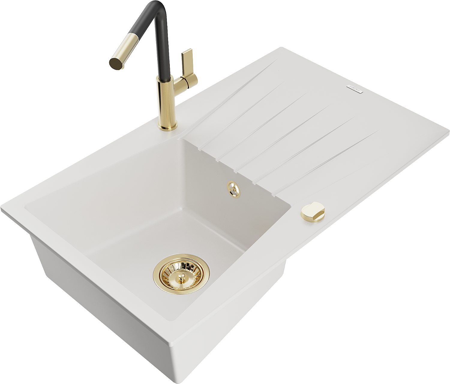 Mexen Cesar granīta izlietne ar vienu nodalījumu ar noteces un virtuves jaucējkrānu Flora, balta - 6514-20-670401-57-G