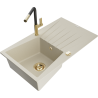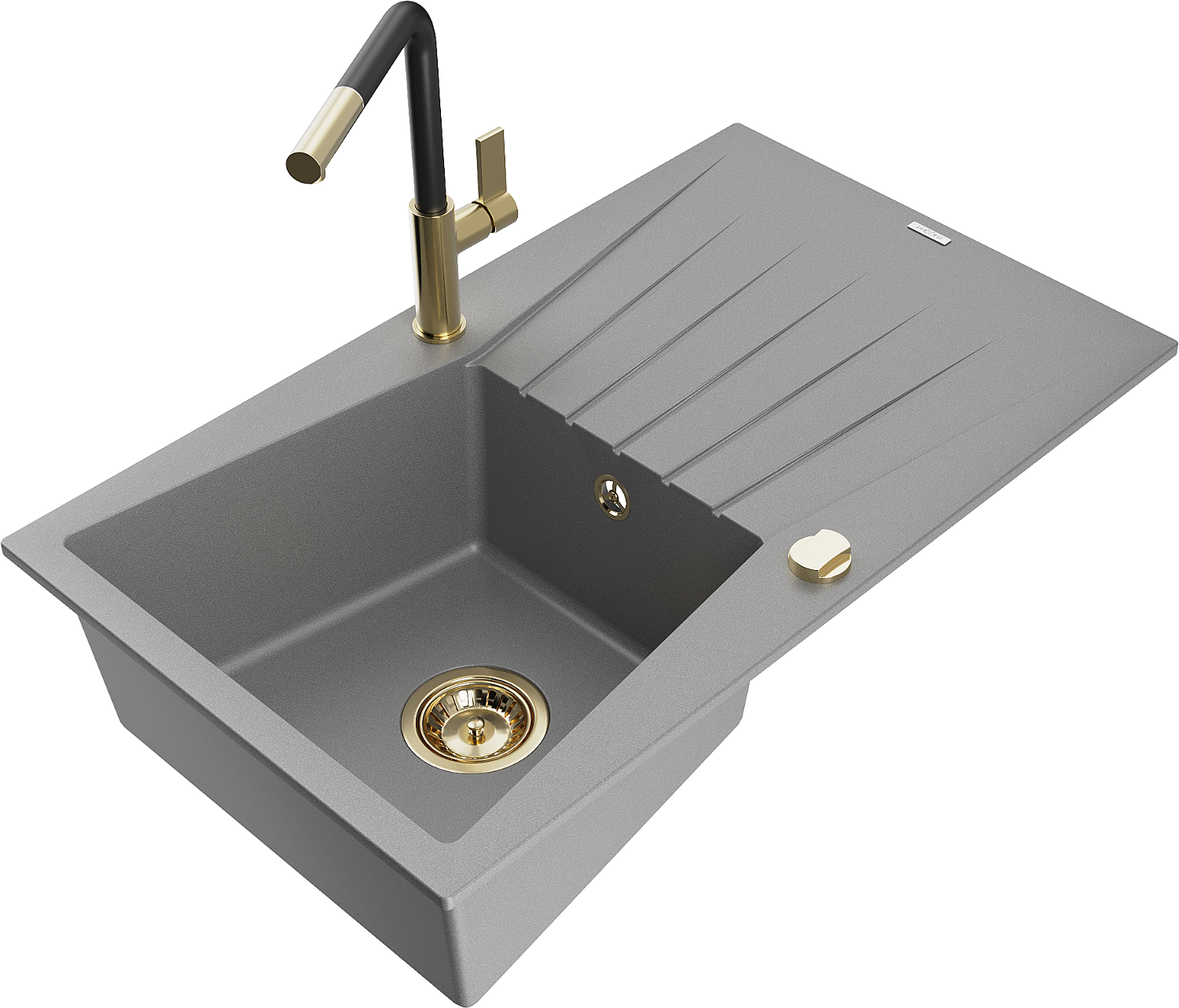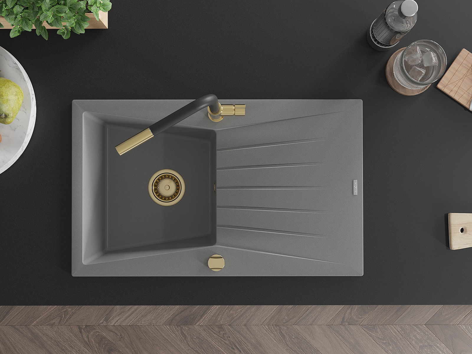 Mexen Cesar granīta izlietne ar 1 nodalījumu un notecinātāju un virtuves jaucējkrānu Flora, pelēka - 6514-71-670401-57-G