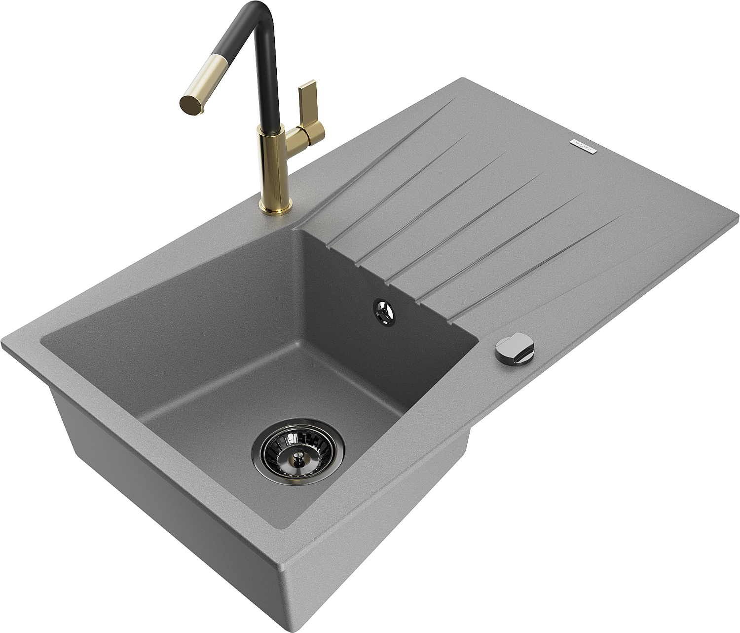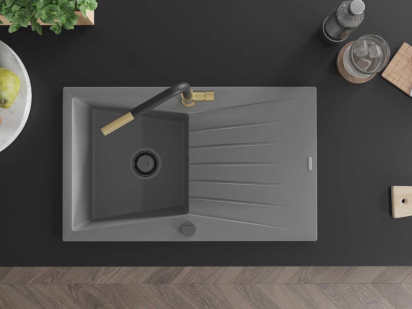 Mexen Cesar granīta izlietne ar vienu nodalījumu, noteces un virtuvju jaucējkrānu Flora, pelēka - 6514-71-670401-57-B