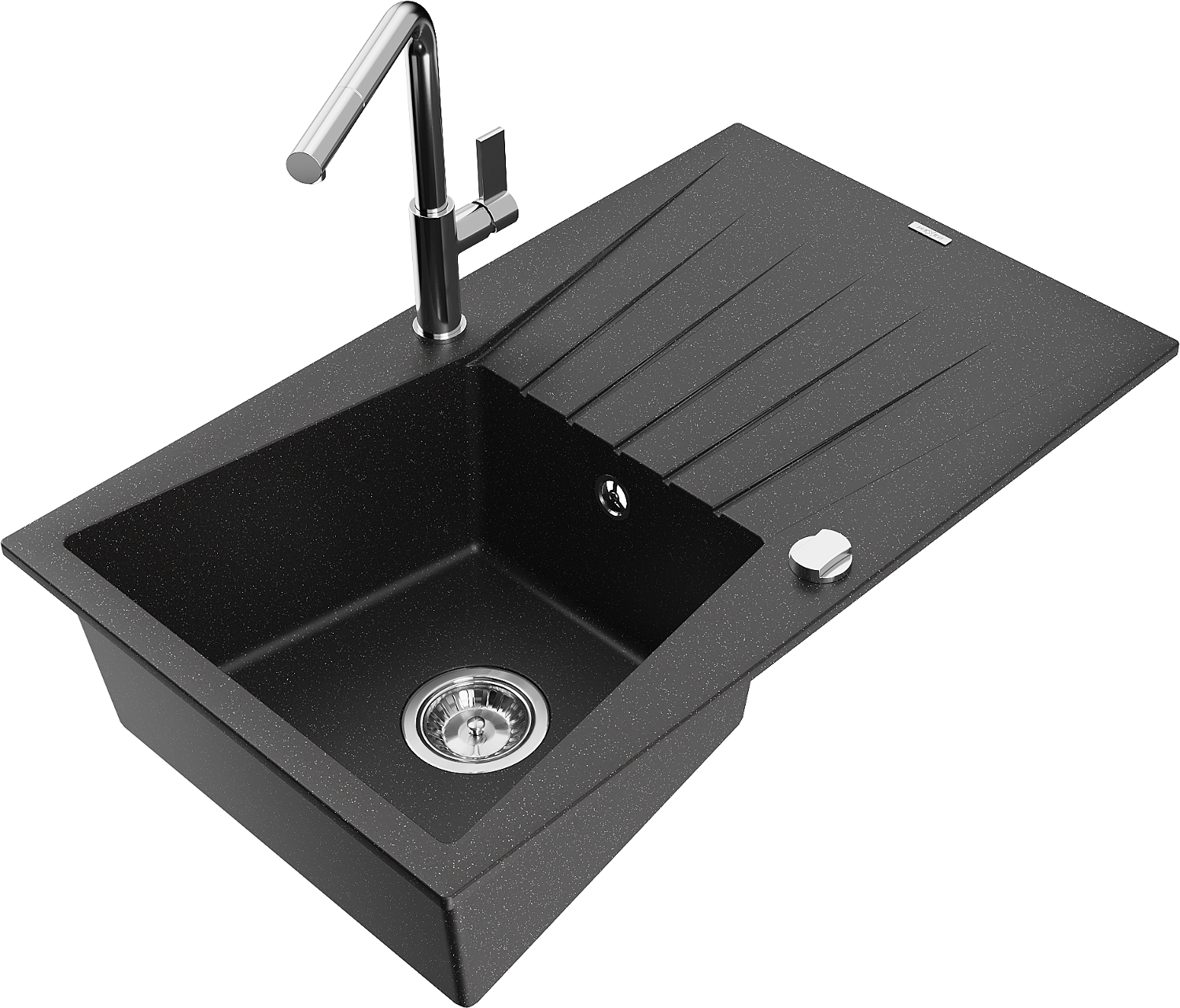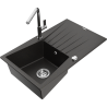 Mexen Cesar granit izlietne ar vienu nodalījumu, iztecētāju un Flora virtuves maisītāju, melna/sudraba metālika