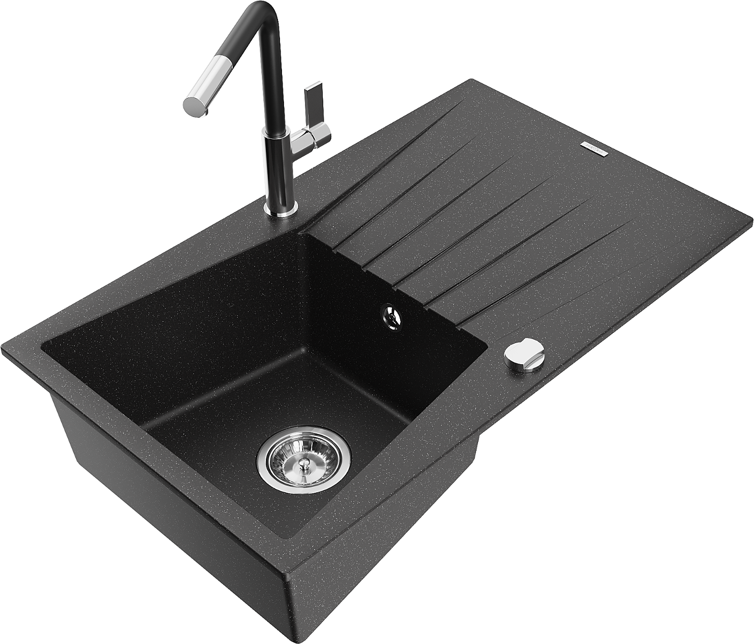 Mexen Cesar granitizlietne ar vienu nodalījumu un noteci un virtuves krānu Flora, melns/sudraba metālika - 6514-73-670401-07