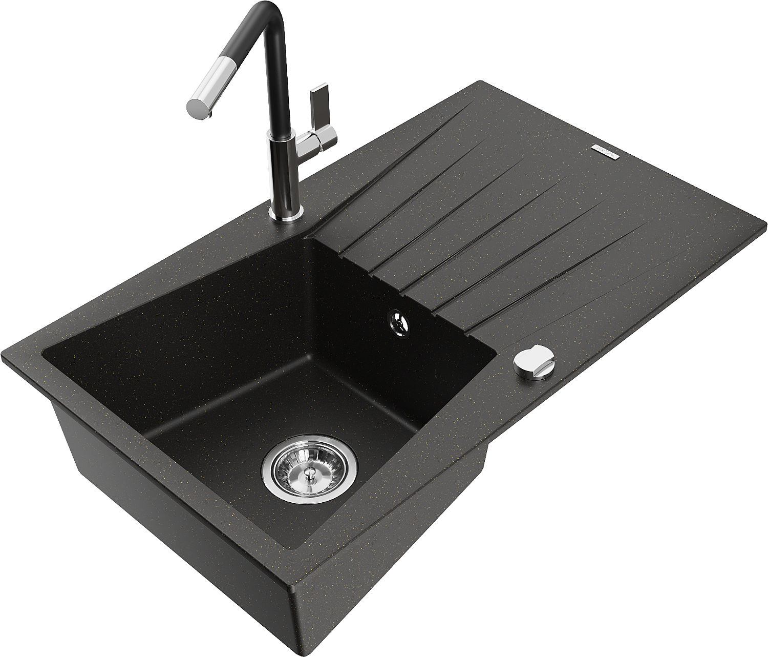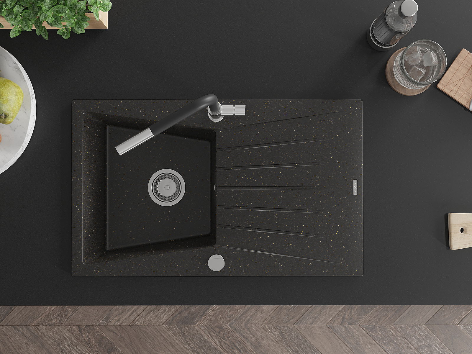 Mexen Cesar granīta izlietne ar vienu nodalījumu, noteka un virtuves krānu Flora, melni/zeltīti metālisks - 6514-75-670401-07