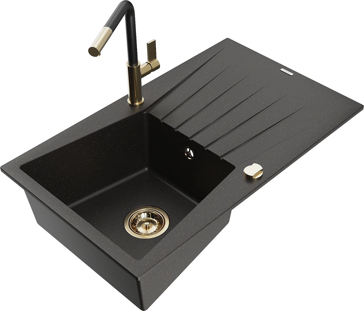Mexen Cesar granīta izlietne ar 1 nodalījumu, notecējums un virtuves krāns Flora, melns/zeltīts metāliskais
