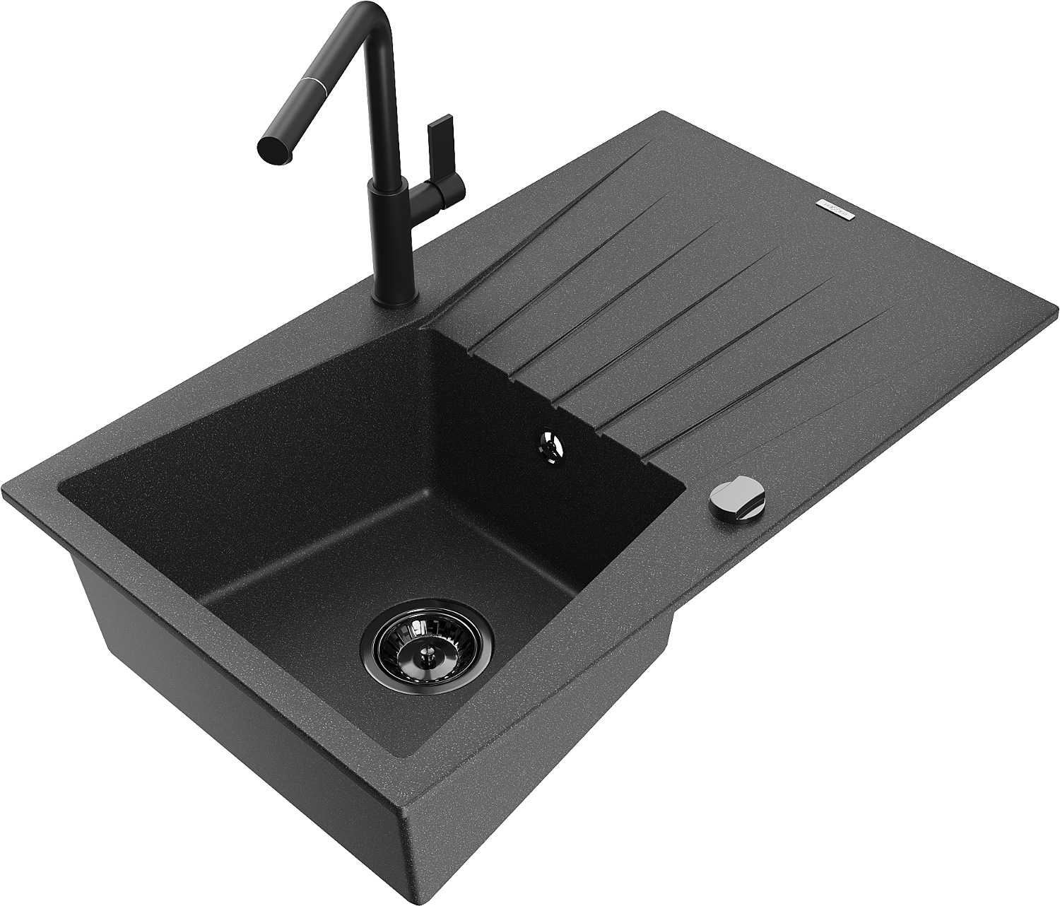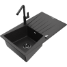Mexen Cesar granitā izlietne ar vienu nodalījumu, ar noteku un Flora virtuves jaucējkrānu, melna ar punktiem