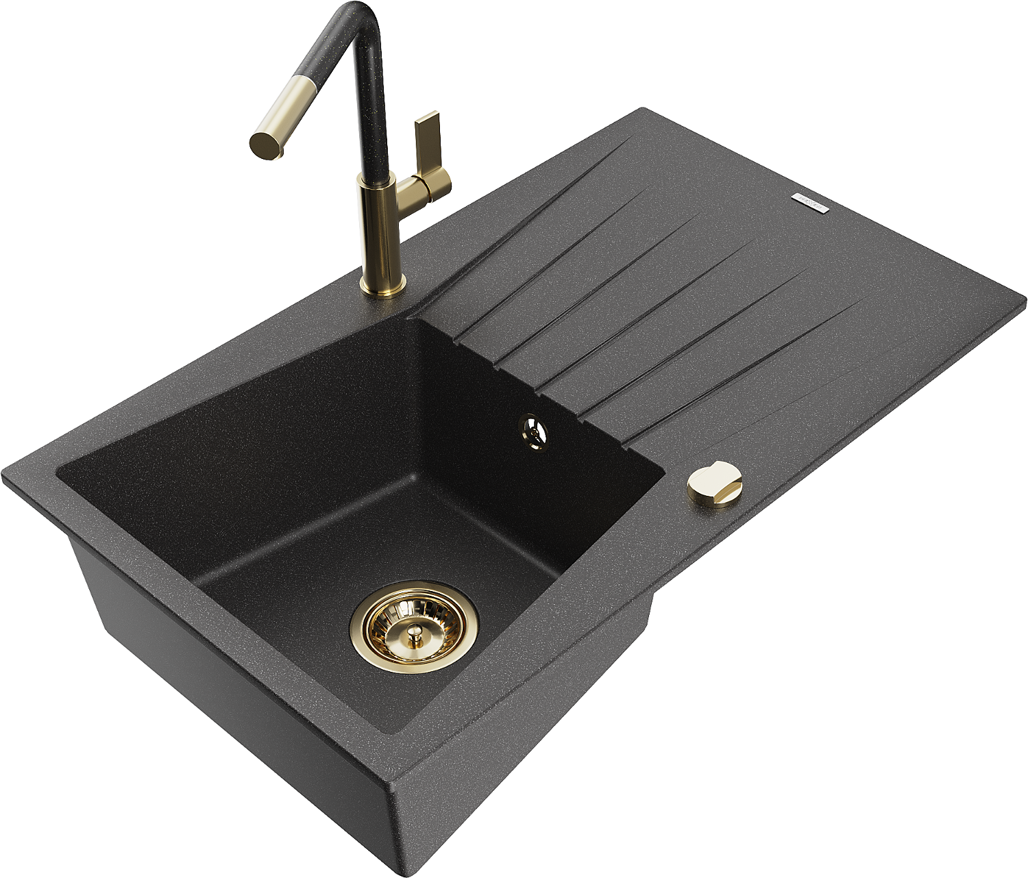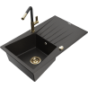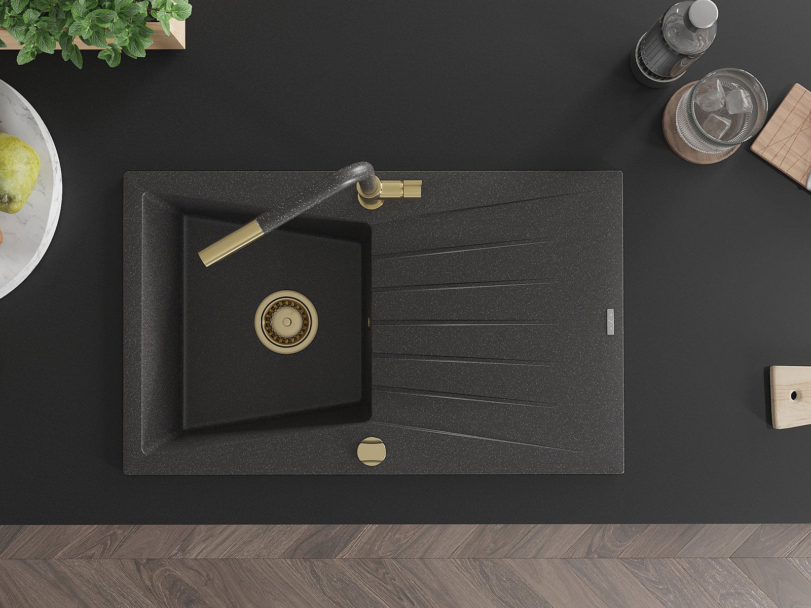 Mexen Cesar granitais izlietne ar vienu nodalījumu, notecēšanu un virtuves krānu Flora, melns ar šļakatām
