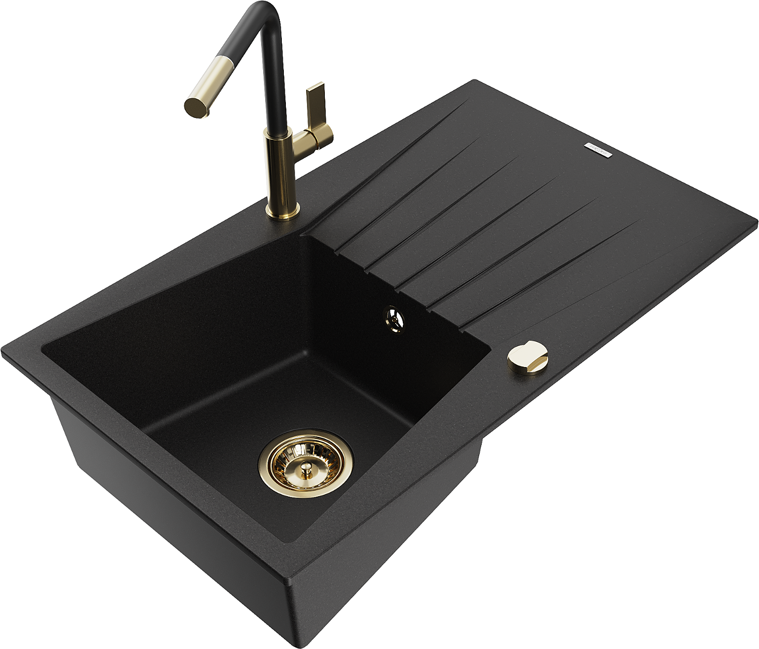Mexen Cesar granitometrs izlietne ar vienu nodalījumu, notecēšanas laukumu un virtuves krānu Flora, melna - 6514-77-670401-57-G