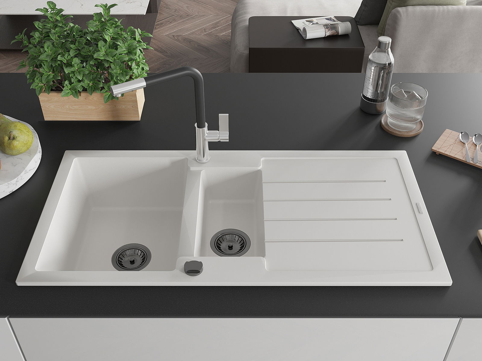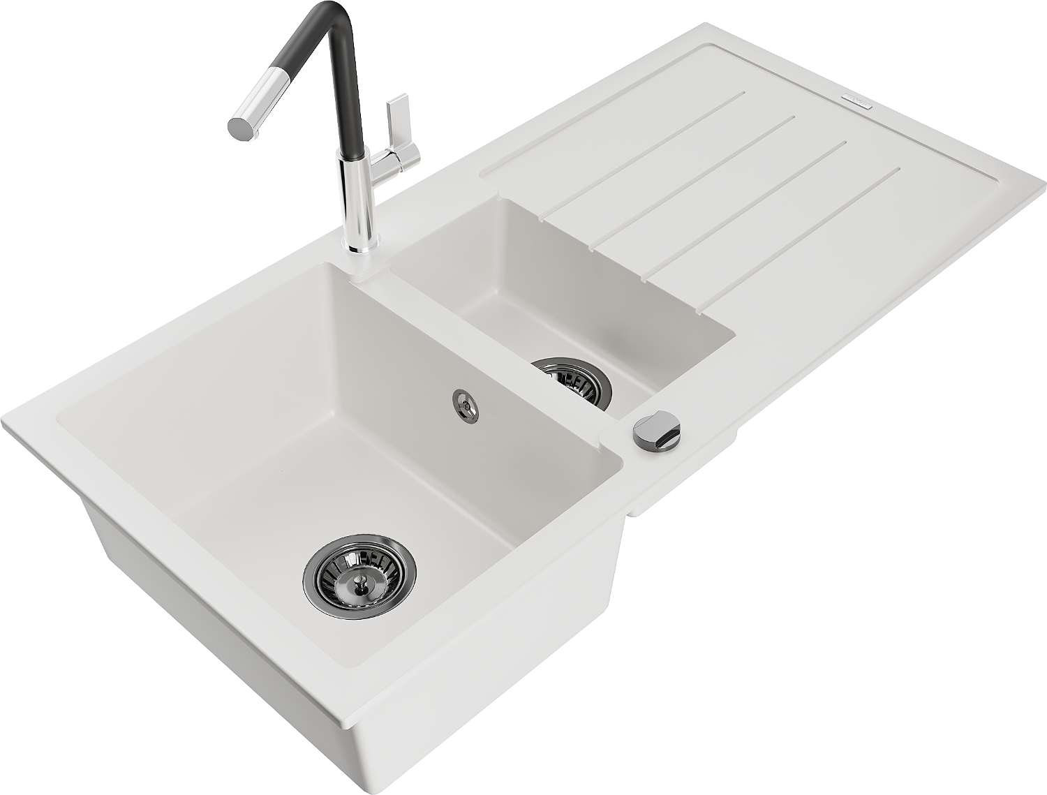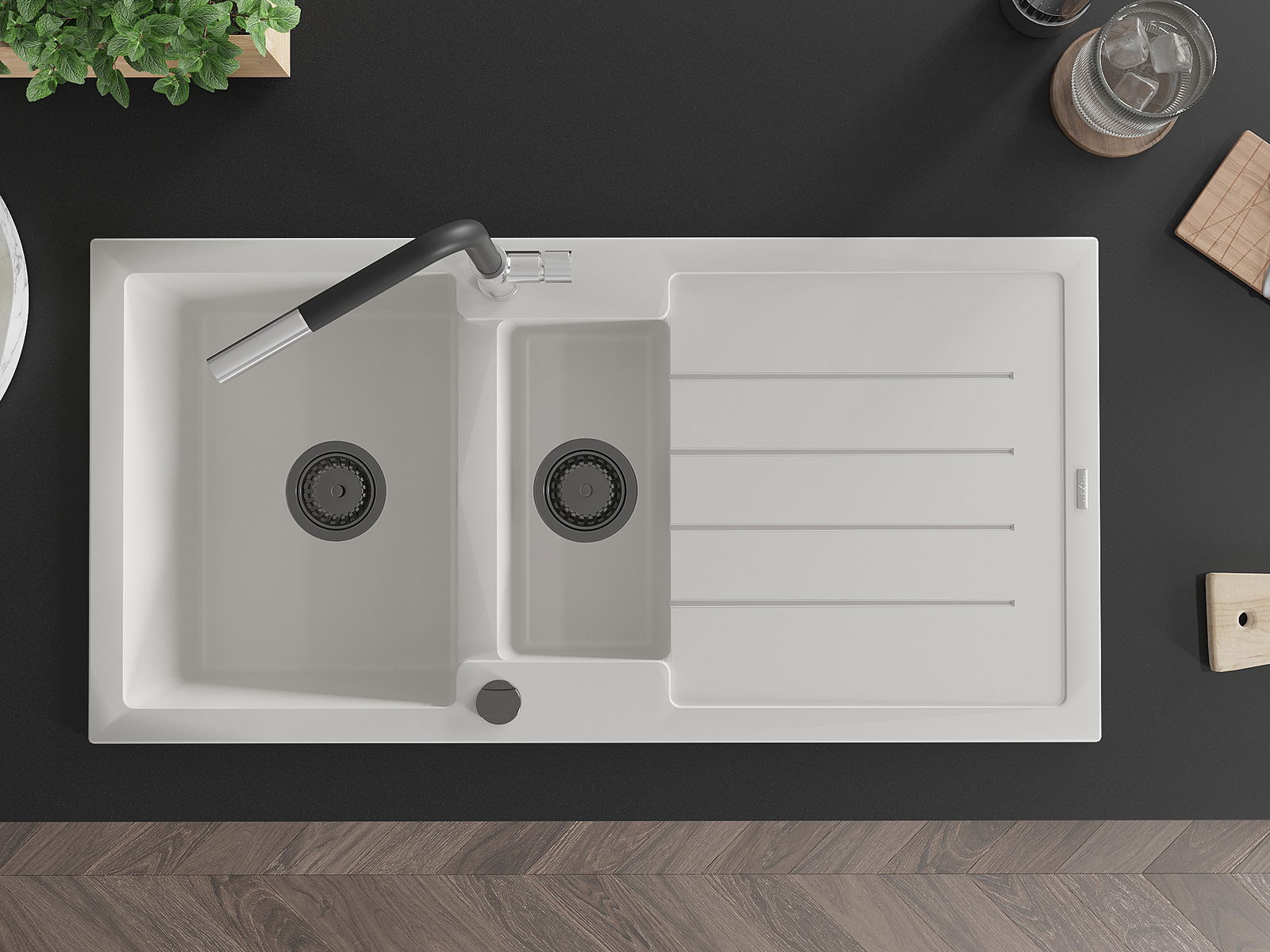 Mexen Andres granit izlietne ar 1,5 nodalījumu, notecētāju un Flora virtuves jaucējkrānu, balts - 6515-20-670401-07-B