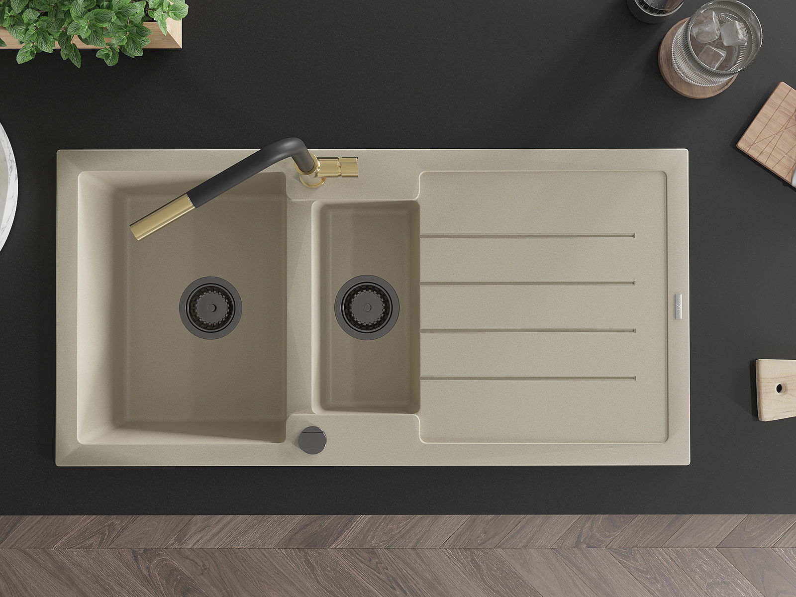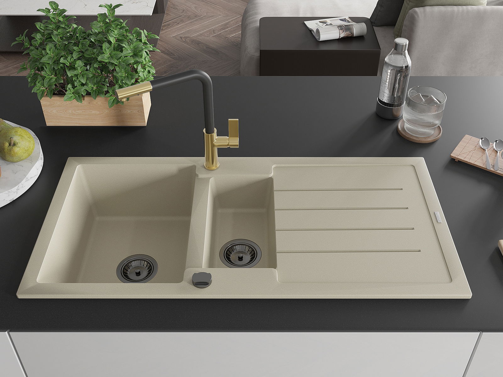 Izlietnei ir 2 daļēji izurbtas atveres ar diametru 35 mm, kuras var pašrocīgi izsist. Tās var izmantot, piemēram, šķidruma dozatora uzstādīšanai, kas novērsīs plastmasas pudeļu klātbūtni virtuvē un piešķirs tai elegantu apdari.